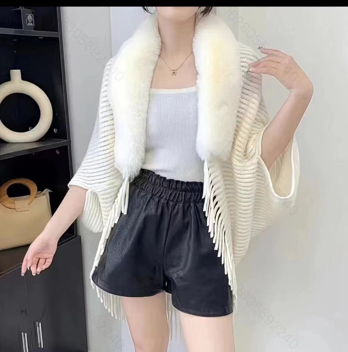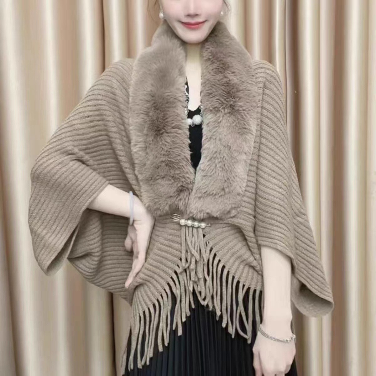 厂家直销秋冬开衫针织毛绒披肩毛领保暖流苏旗袍外套时尚宽松款
