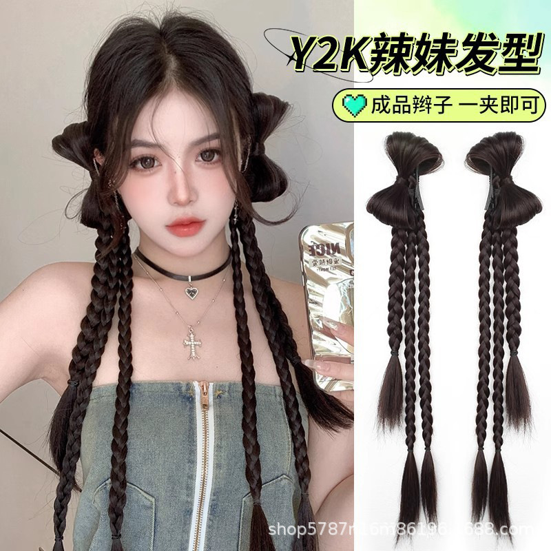 かつら三つ編みポニーテール y2k 新中国風リボンボクシング三つ編みダブルポニーテール中国風手織り三つ編み