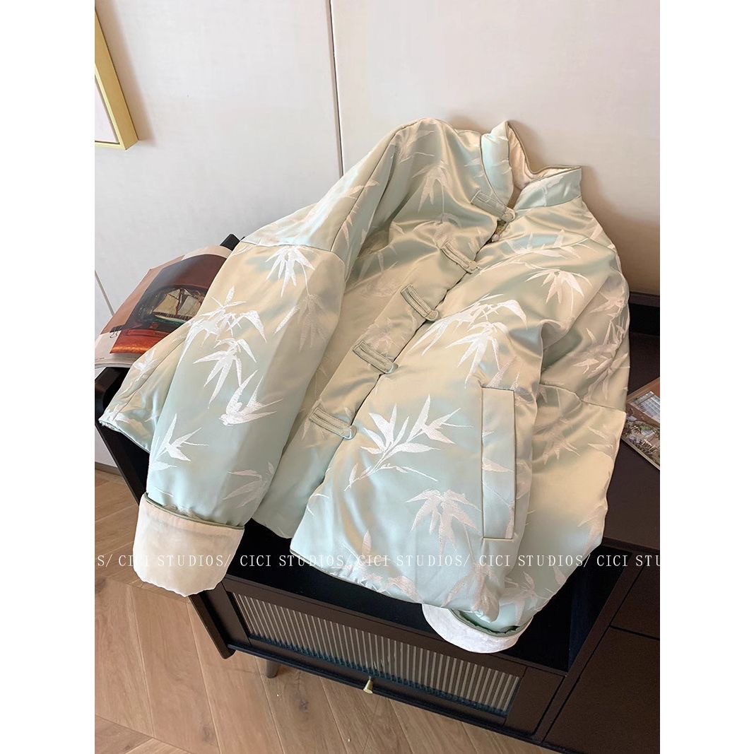 新中式国风竹叶印花棉服外套女冬季2025新款加厚保暖夹棉唐装上衣