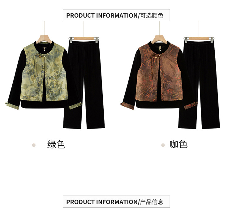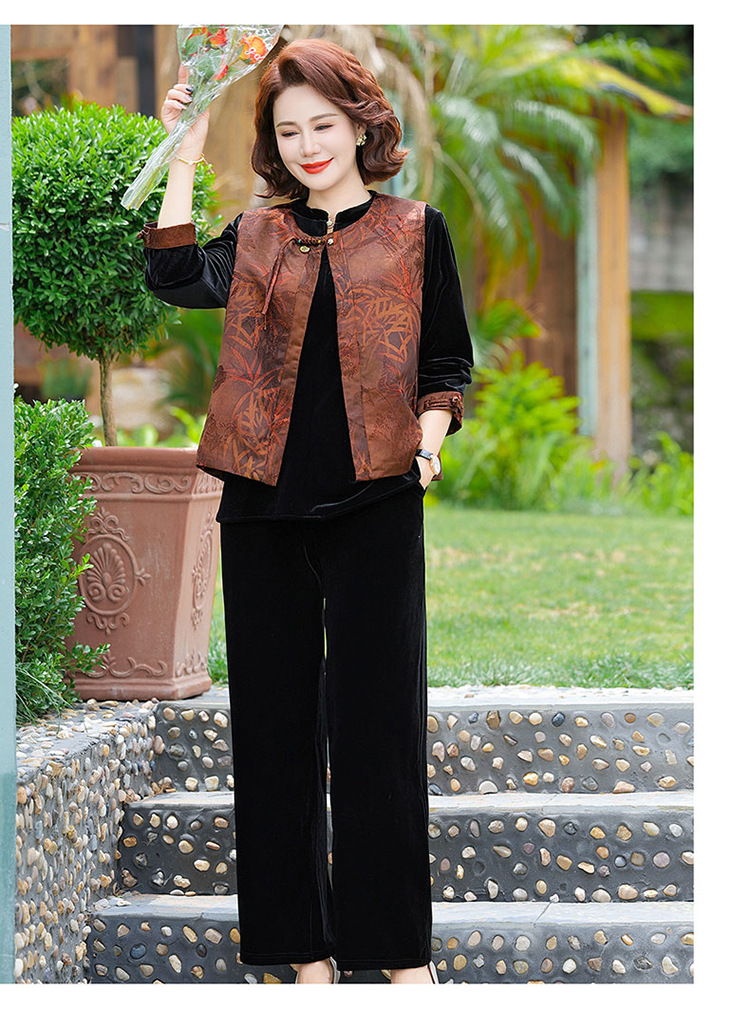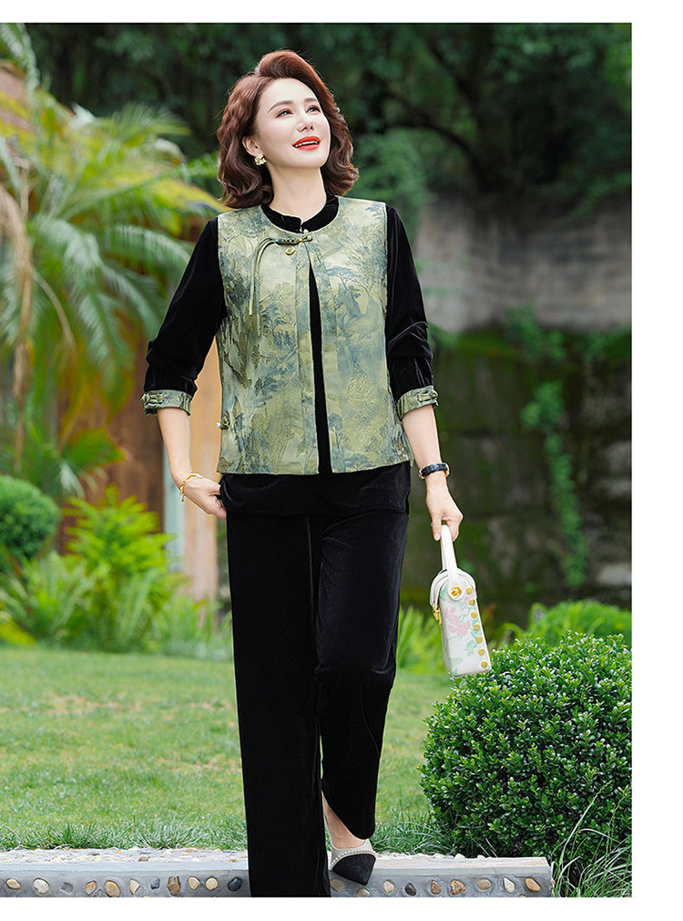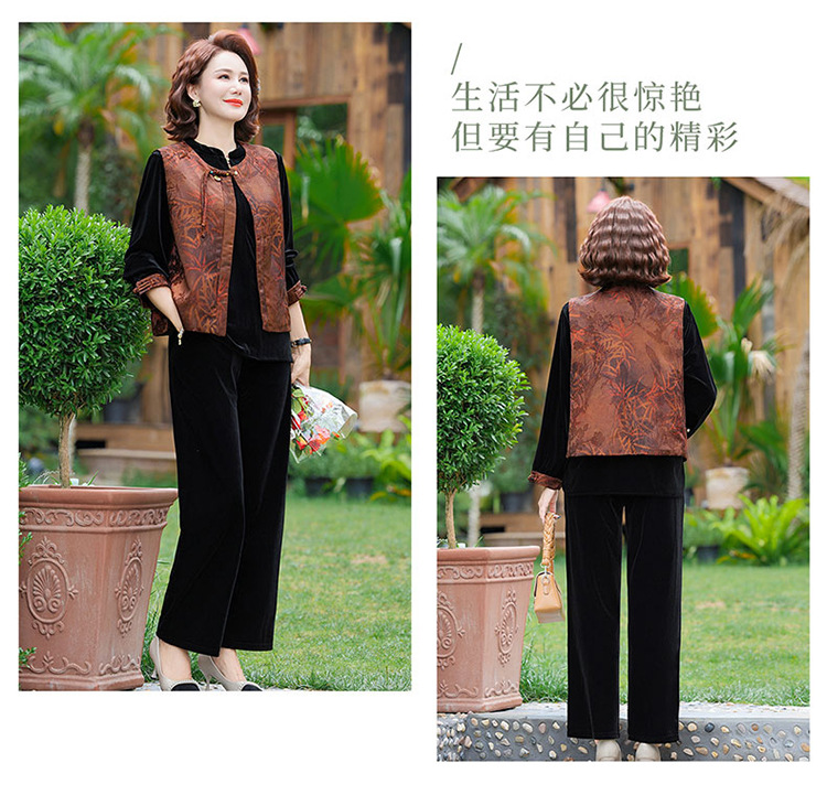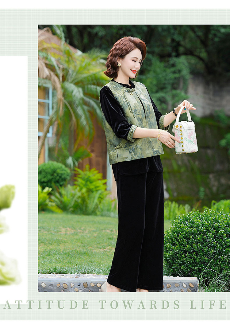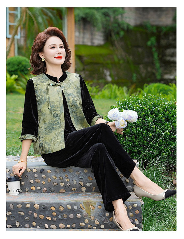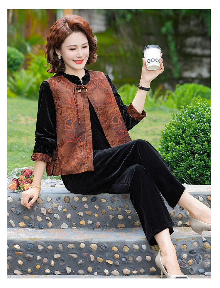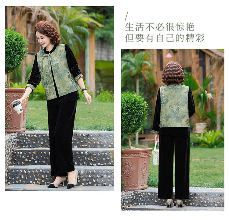 批发秋季中式国风马夹打底衫直筒裤三件套中老年妈妈装丝绒套装