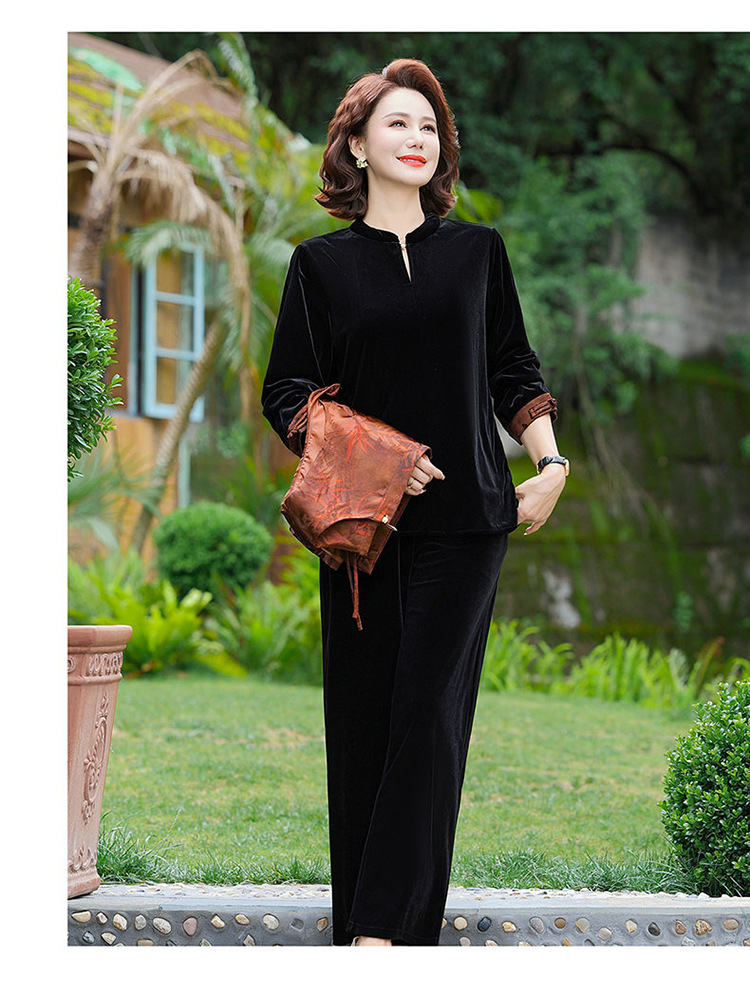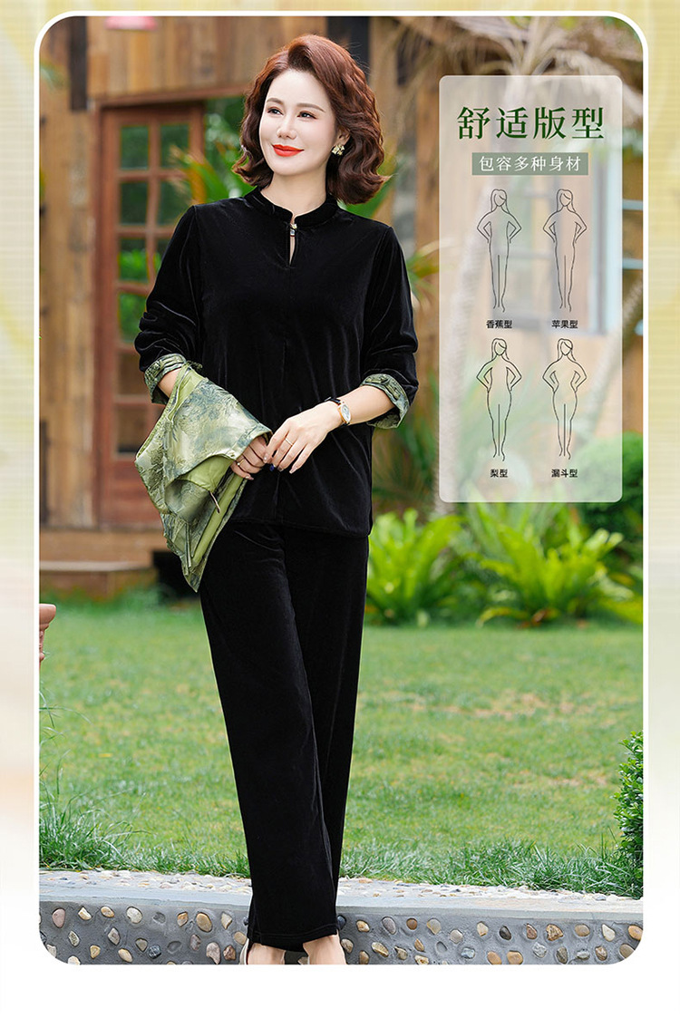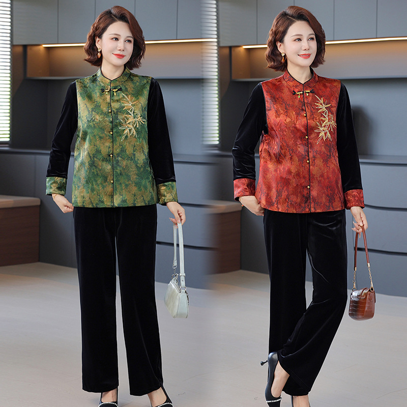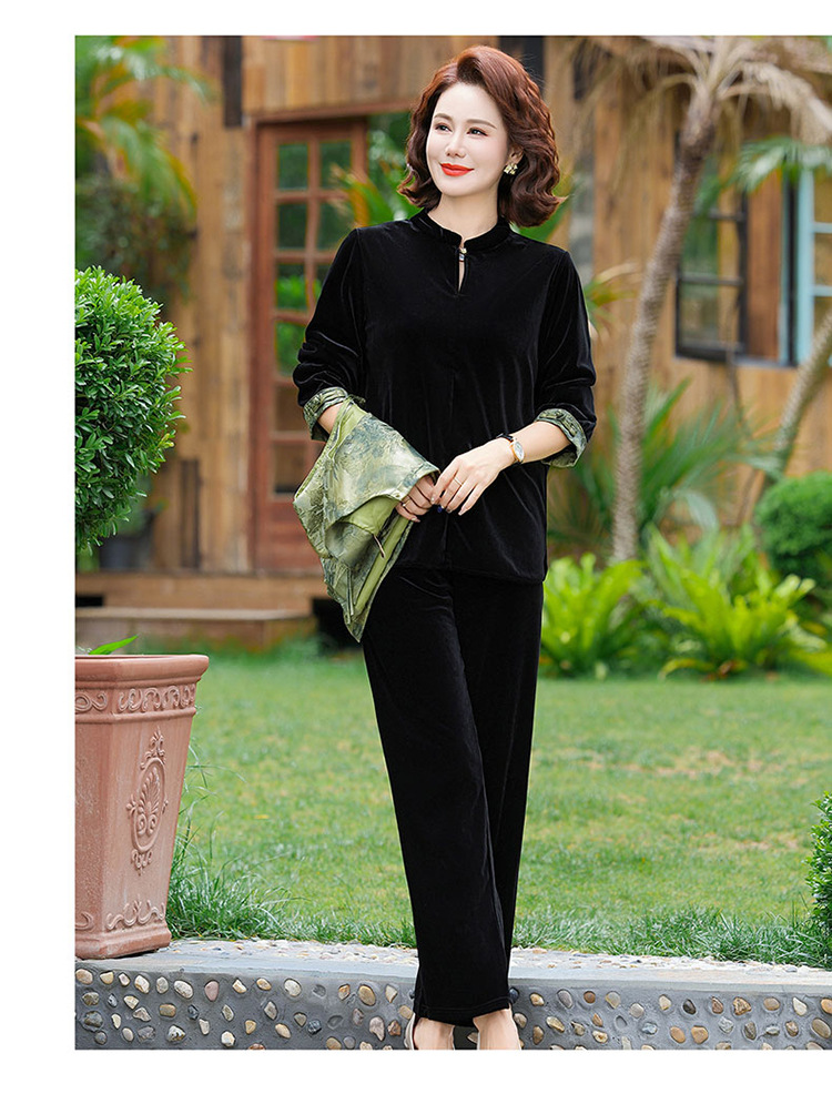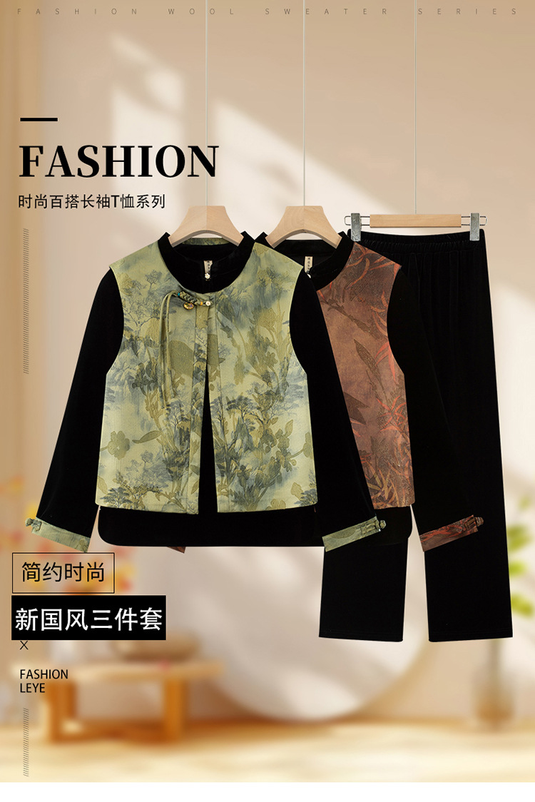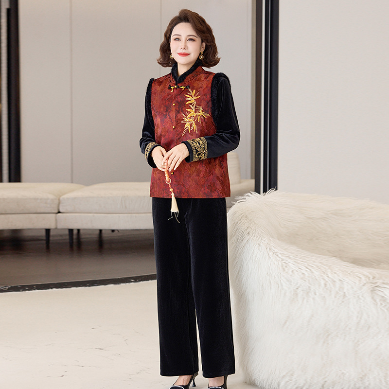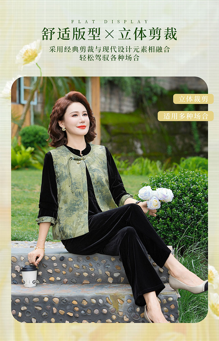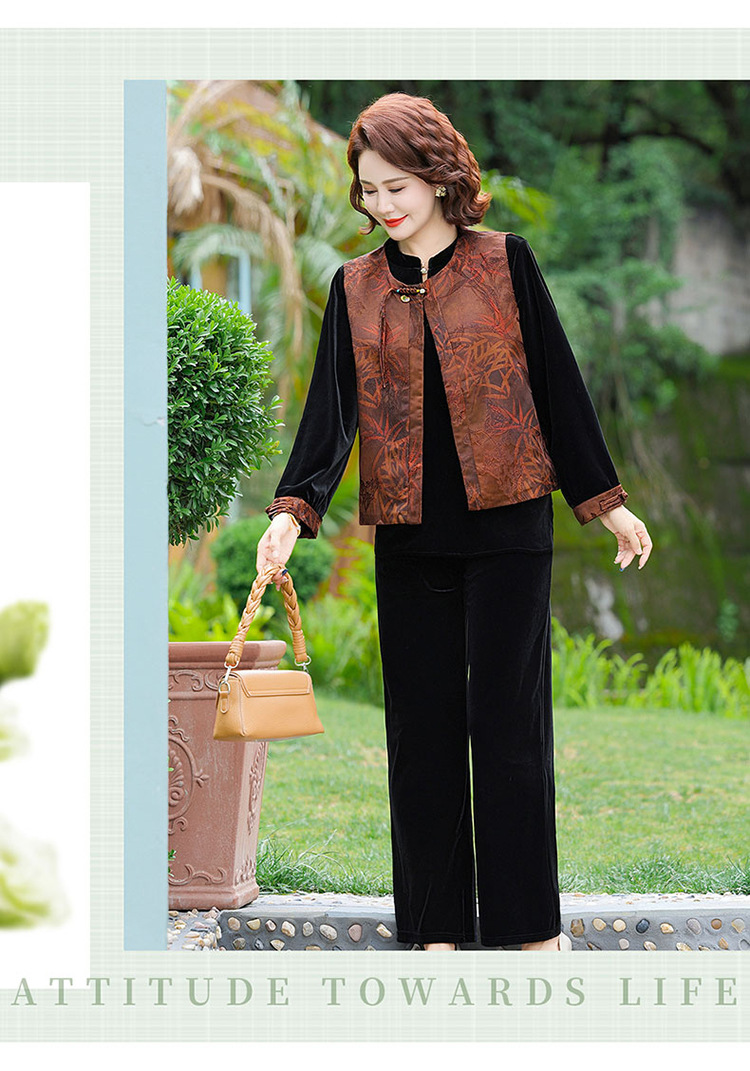 批发秋季中式国风马夹打底衫直筒裤三件套中老年妈妈装丝绒套装