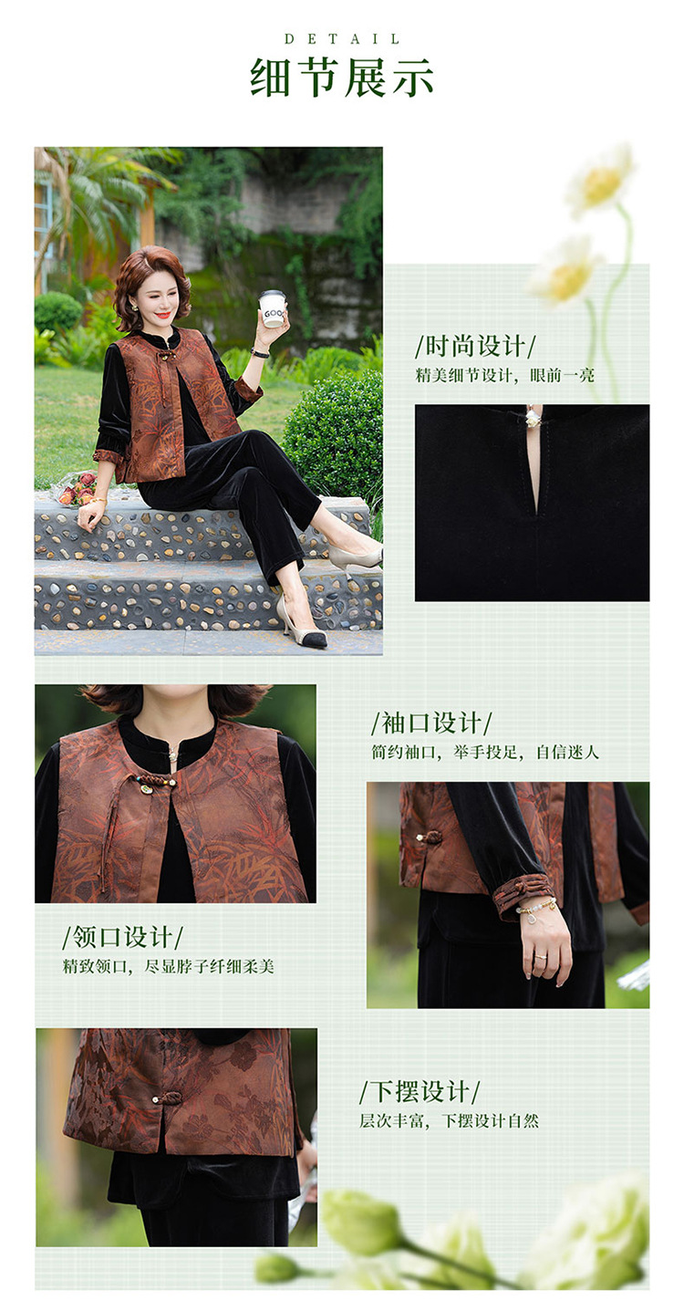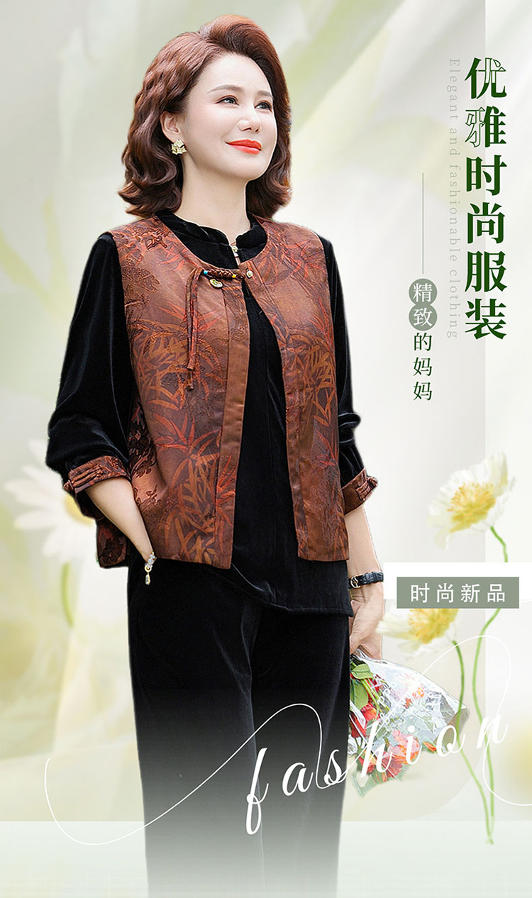 中式妈妈金丝绒国风套装新款中老年女装洋气加厚马甲三件套上衣