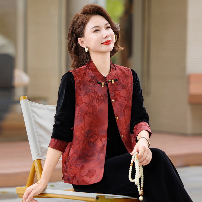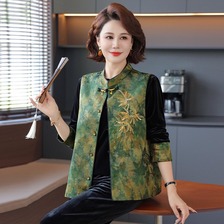 中老年女装国风马甲上衣套装中式新款中年妈妈装春秋装丝绒两件套
