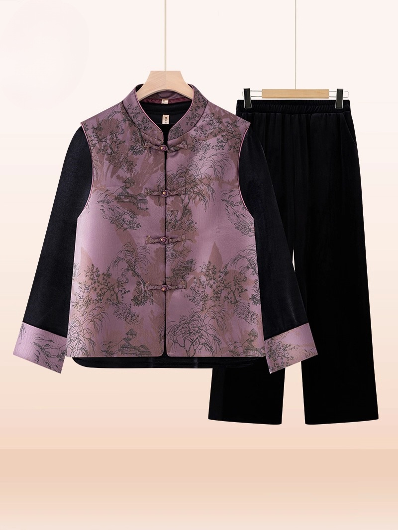 批发妈妈秋装套装2025新款丝绒中式国风唐装上衣中老年马甲三件套