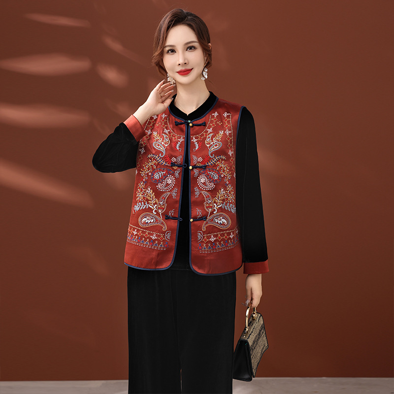新中式妈妈秋装外套改良唐装马甲高端刺绣盘扣中老年新款两件套装