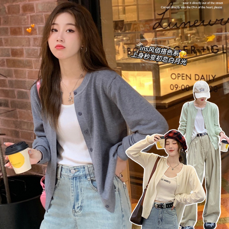 ラウンドネック長袖カーディガン夏薄手コートショールアプリコットセーター春秋無地ショート日焼け止めシャツ