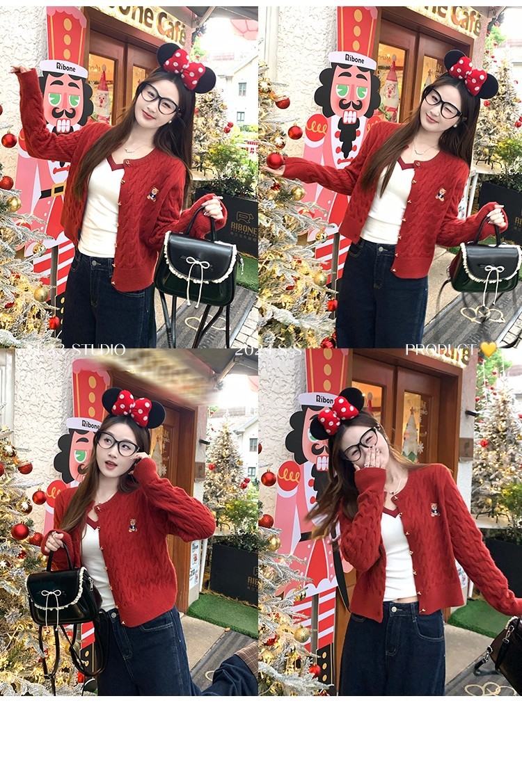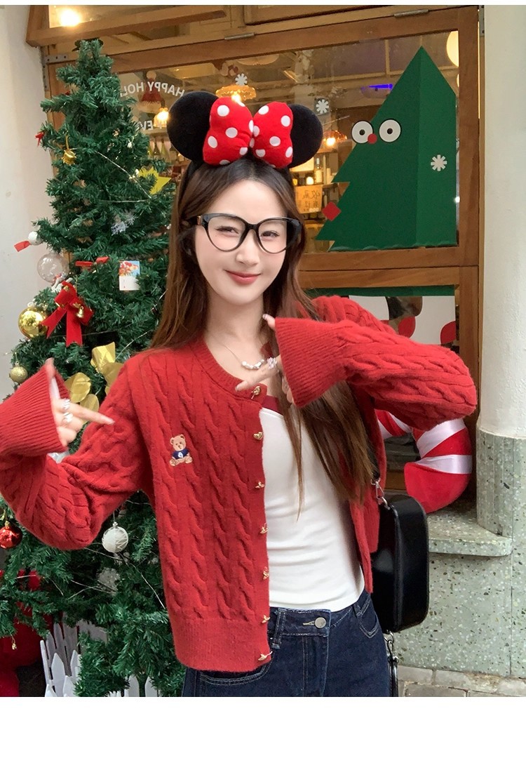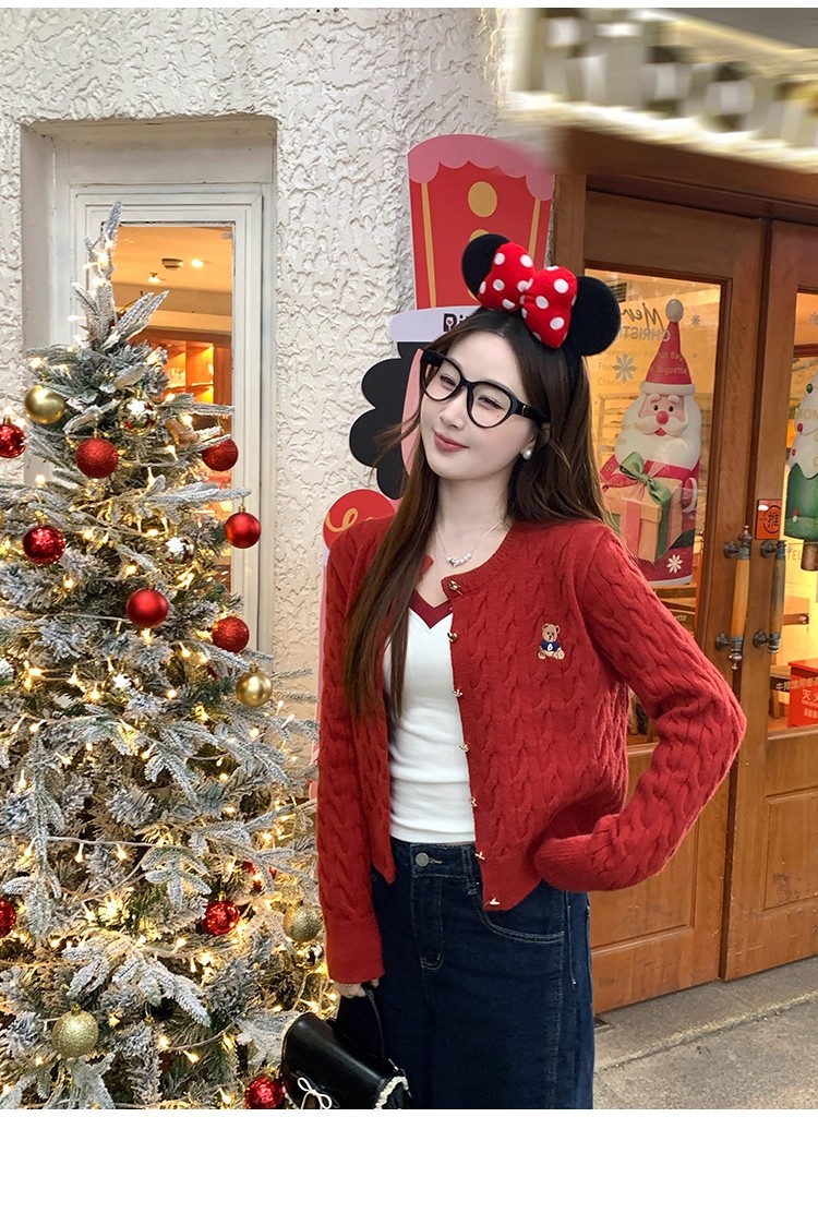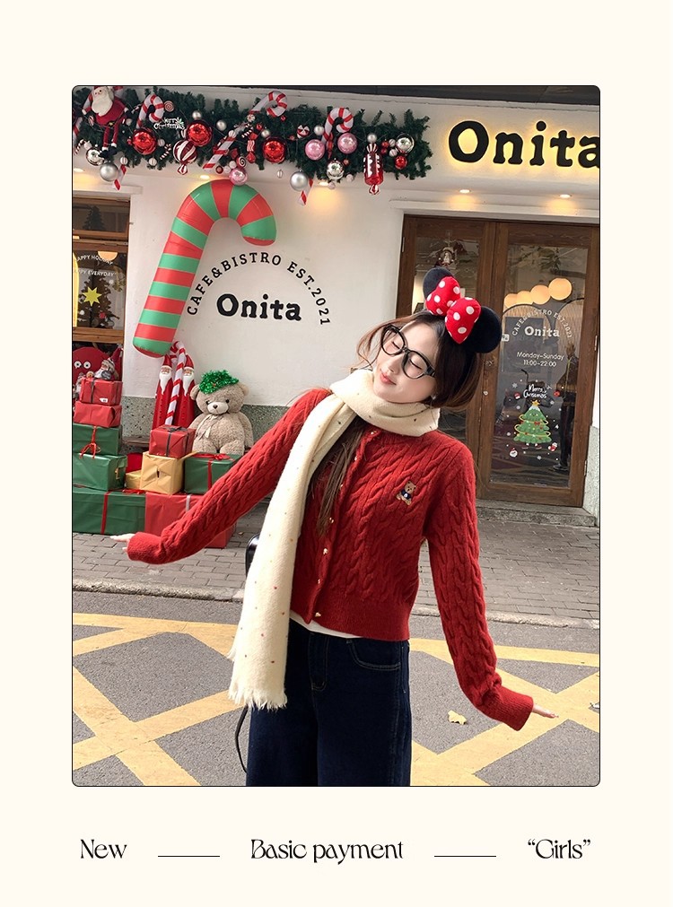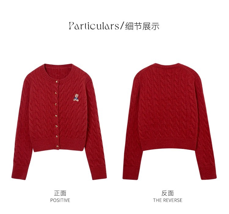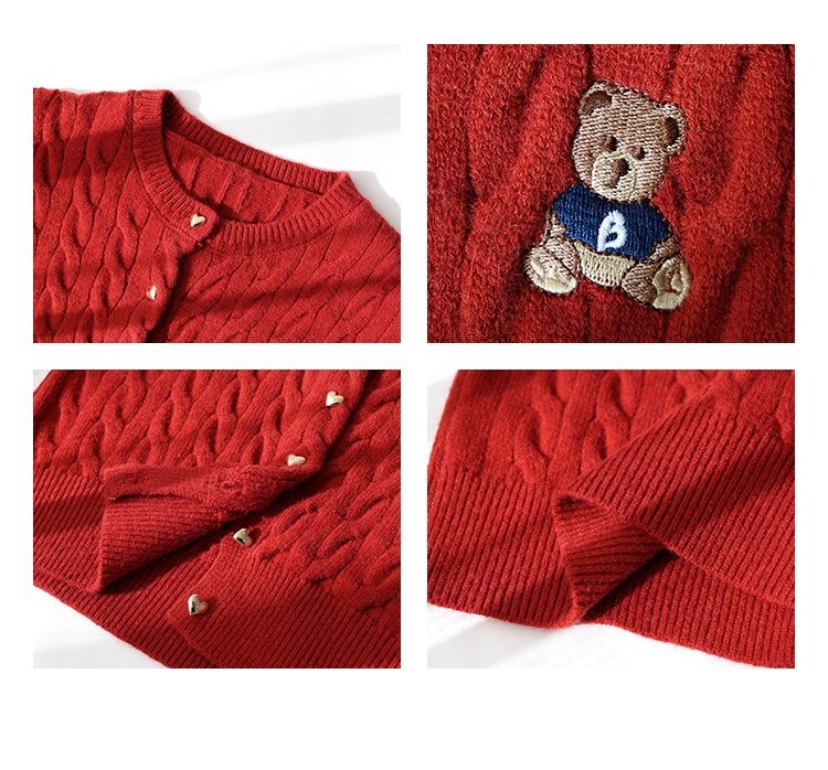 红色毛衣开衫女秋冬高级感新年穿搭小熊学院风上衣