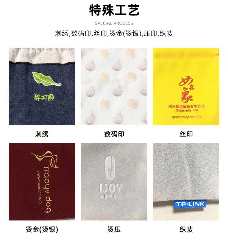 【工艺】:丝印,烫金,压印,刺绣,布标,热转印等。