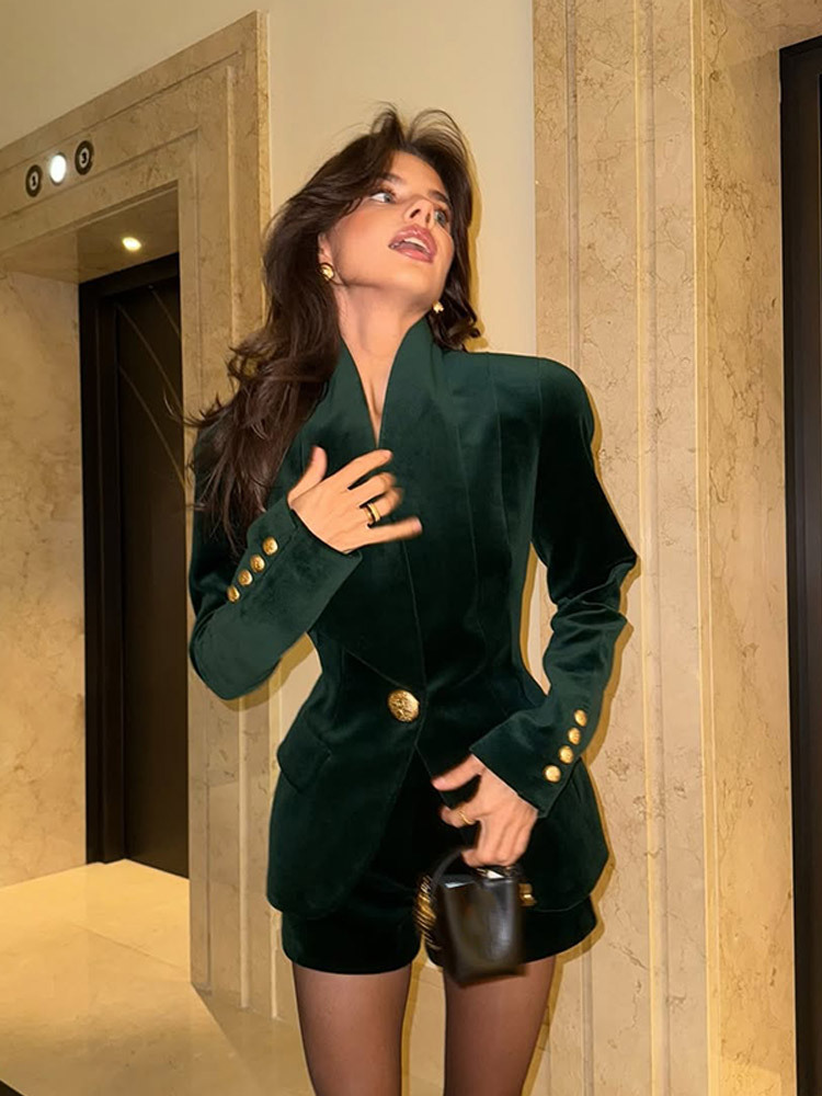 气质职业装纯色立领深V纽扣外套短裤套装女2025跨境欧美风新款