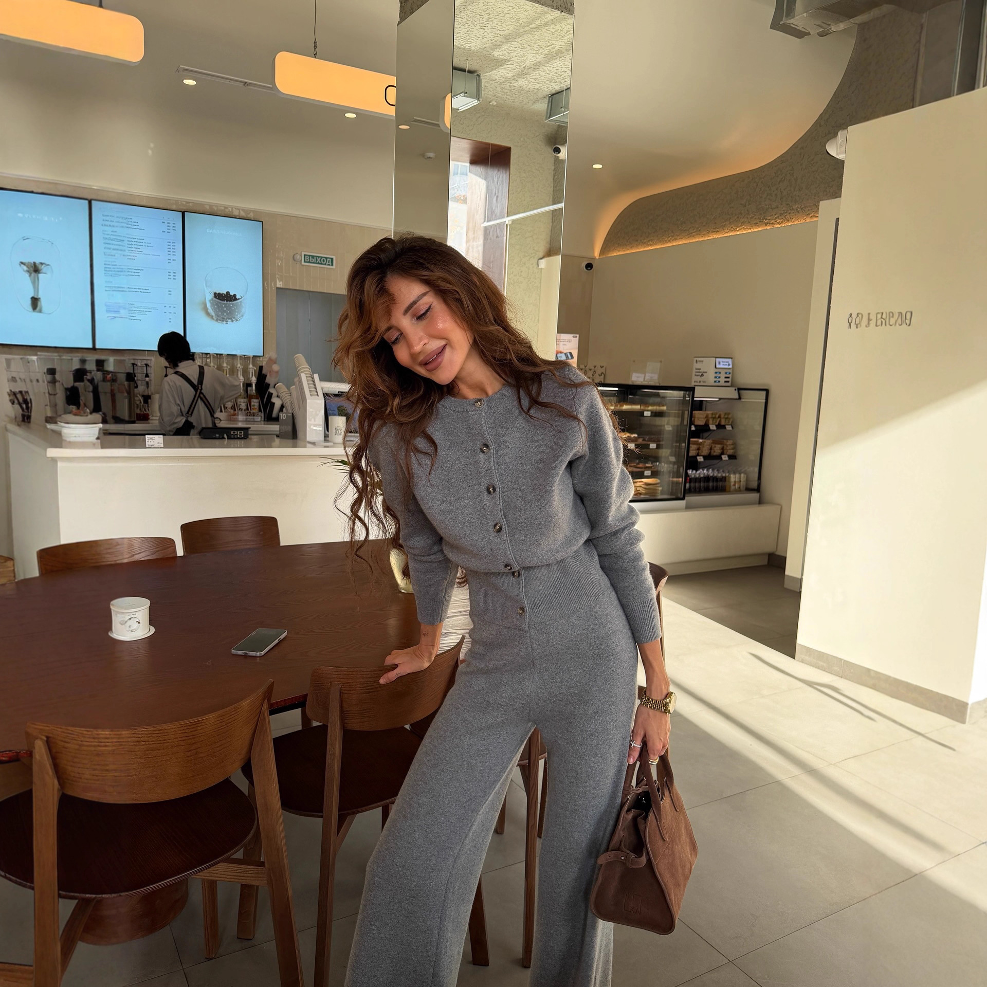 秋冬简约纯色圆领长袖针织开衫套装小众慵懒内搭直筒长裤两件套潮