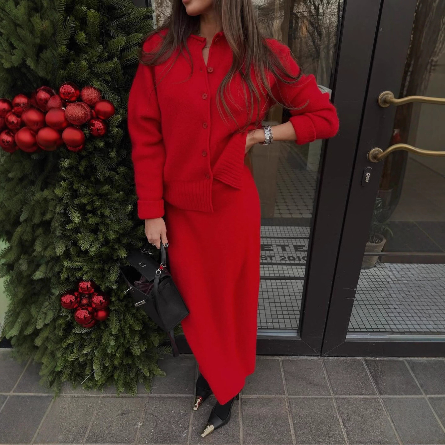 2025新款休闲时尚针织套装女纯色高级圣诞红色修身半身长裙两件套