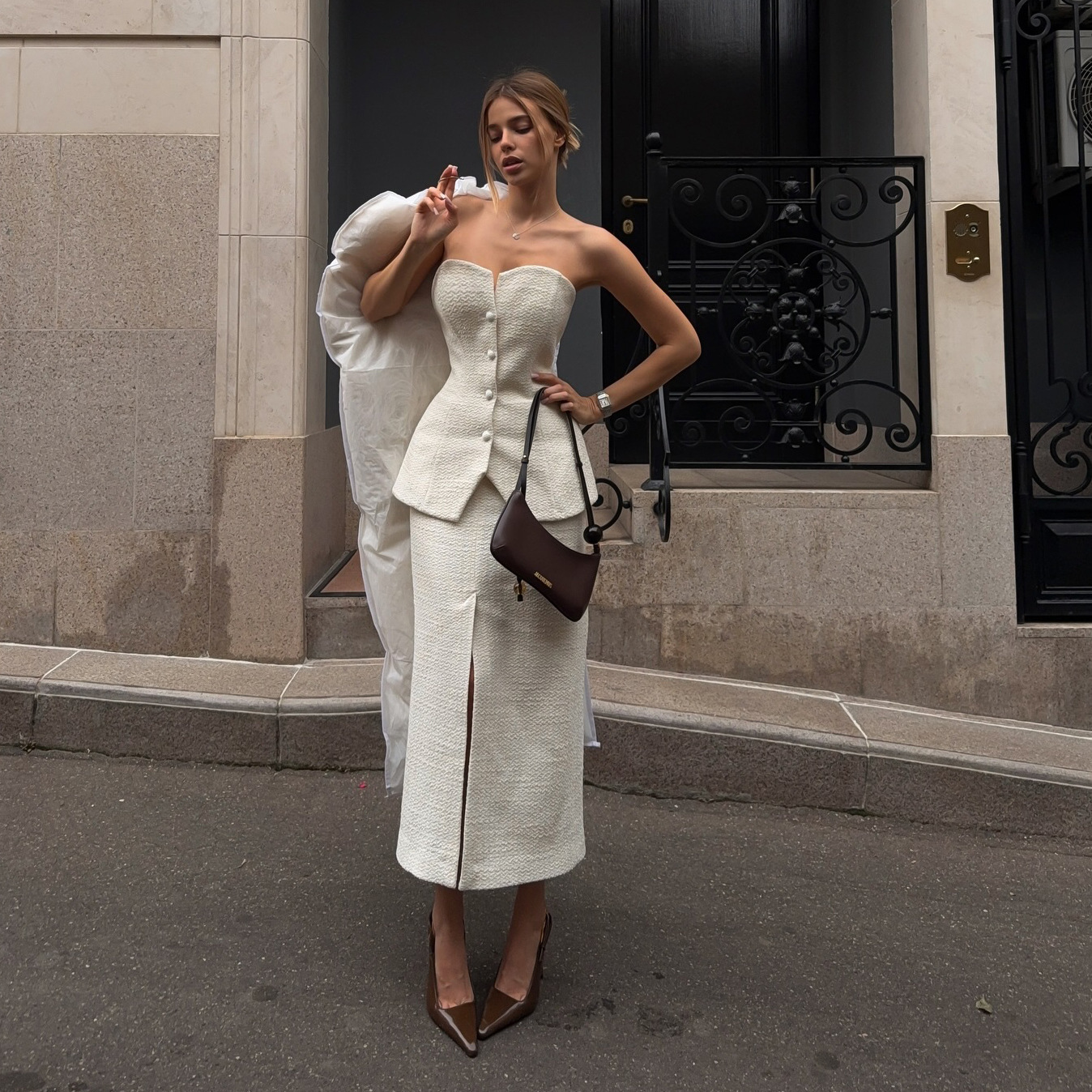 跨境热卖小香风抹胸套装裙上衣配开叉半身长裙气质白色优雅名媛风