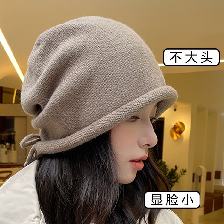 网红堆堆帽女秋冬显脸小包头冷帽大头围护耳抽绳卷边针织毛线帽子