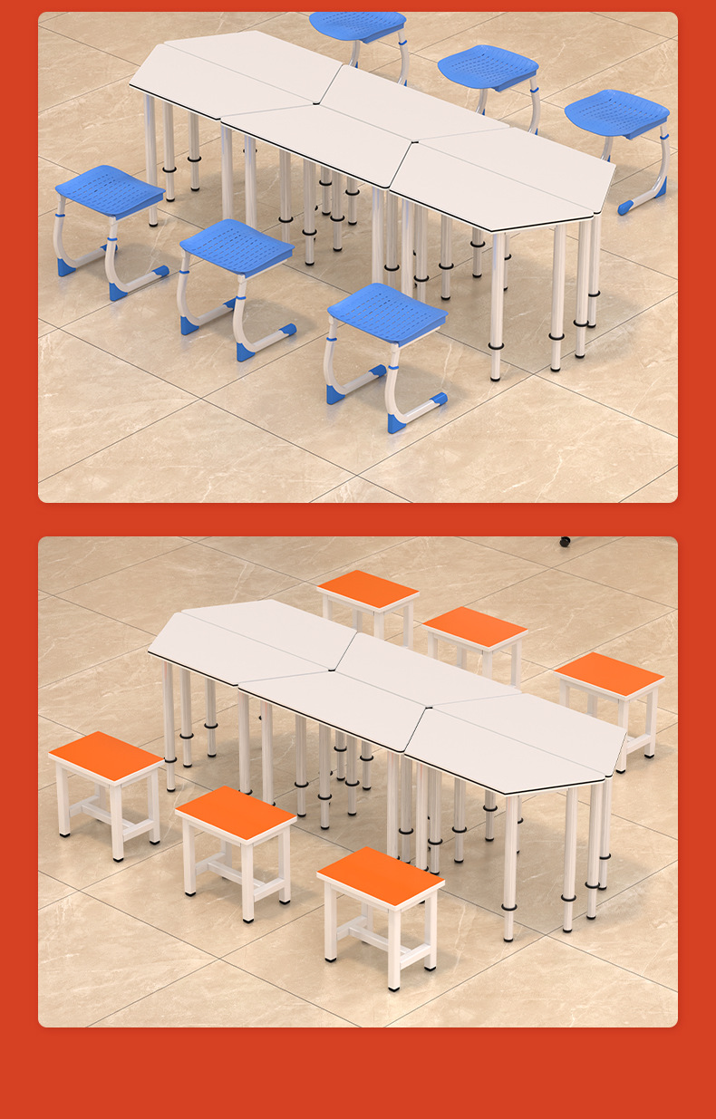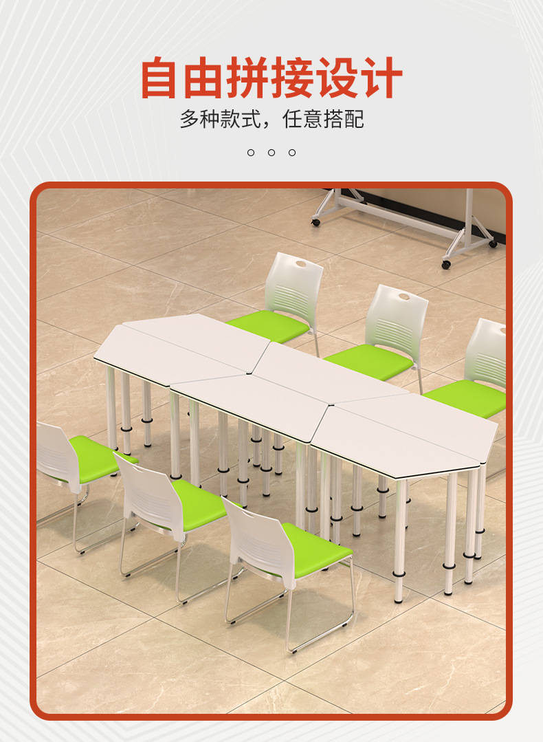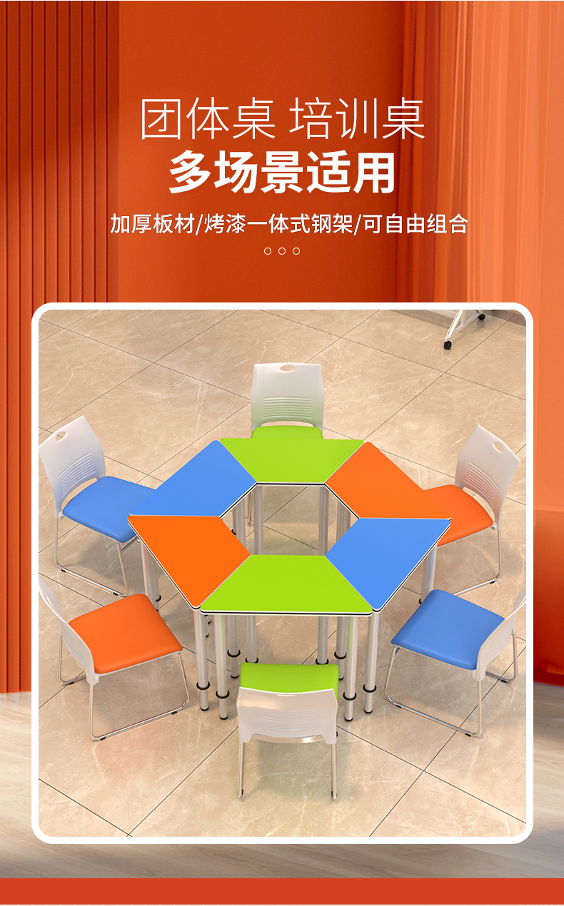 団体の指導台形の組み合わせのテーブルと椅子の六角形のトレーニングテーブルの活動教室の学生の机は会議のテーブルをつなぎ合わせます。