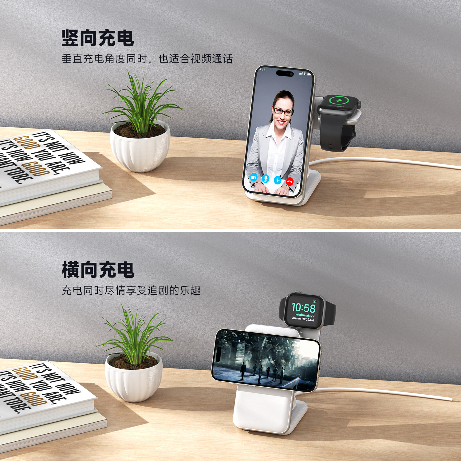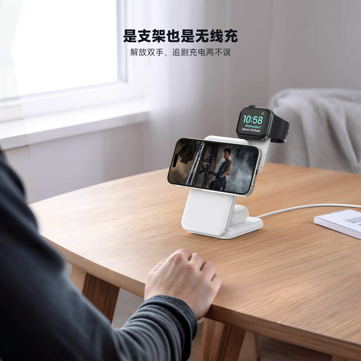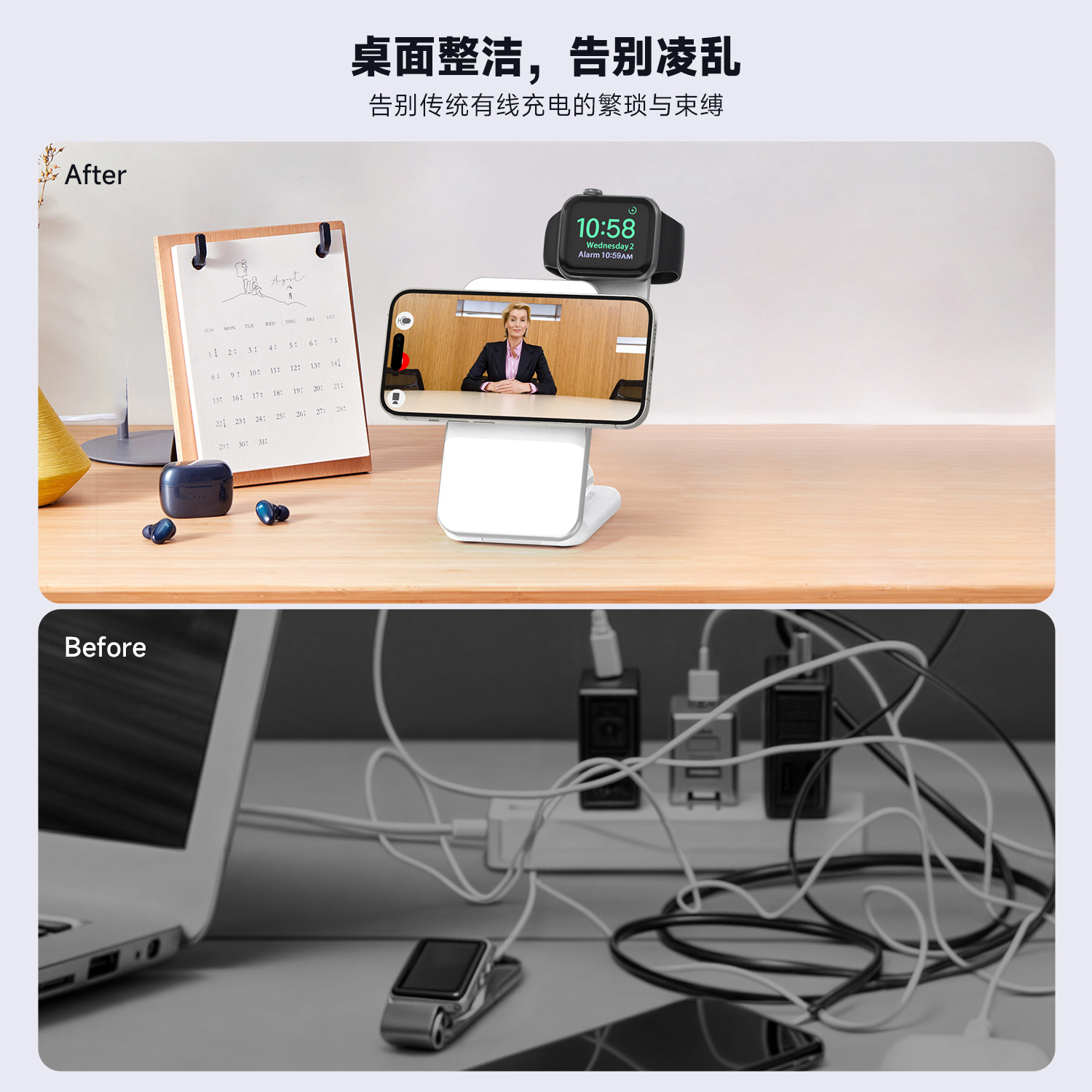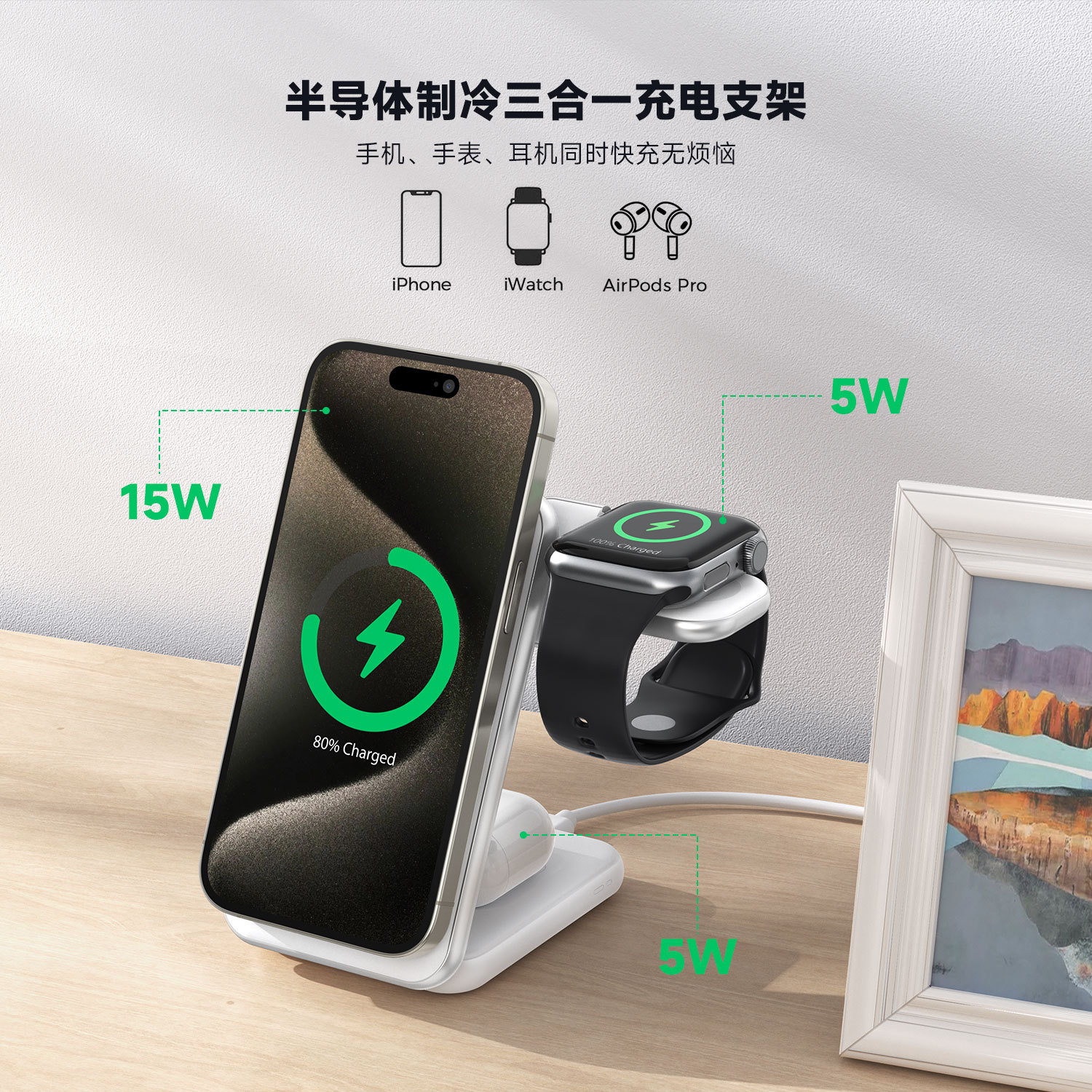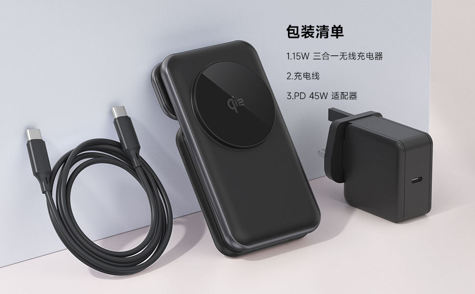 2.桌面救星:无线充电解线缠烦恼,桌面清爽;多设备适配:手机、手表、耳机皆可用;15W 快充 + 制冷,充电流畅不发烫;折叠便携,出差旅行轻松装。