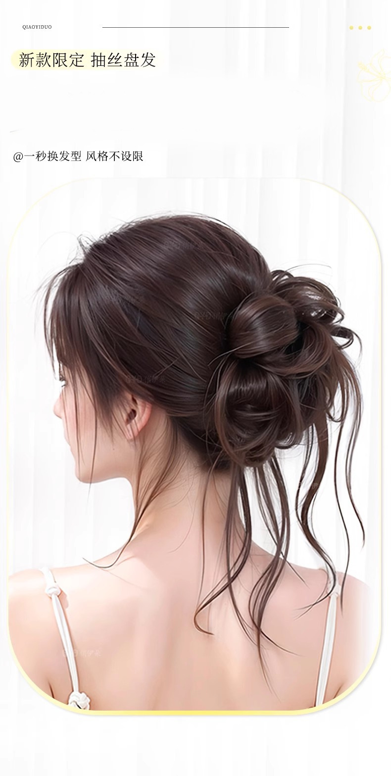 女性メイクアップアーティスト向けの糸引きミートボールヘアウィッグ、同じスタイルのヘアクリップ、ナチュラルふわふわつぼみヘア