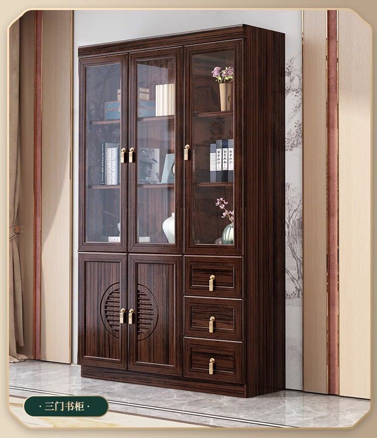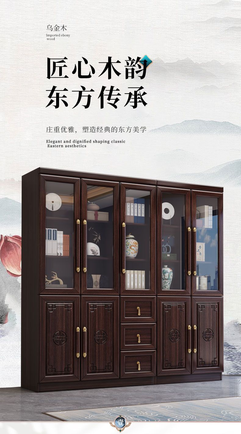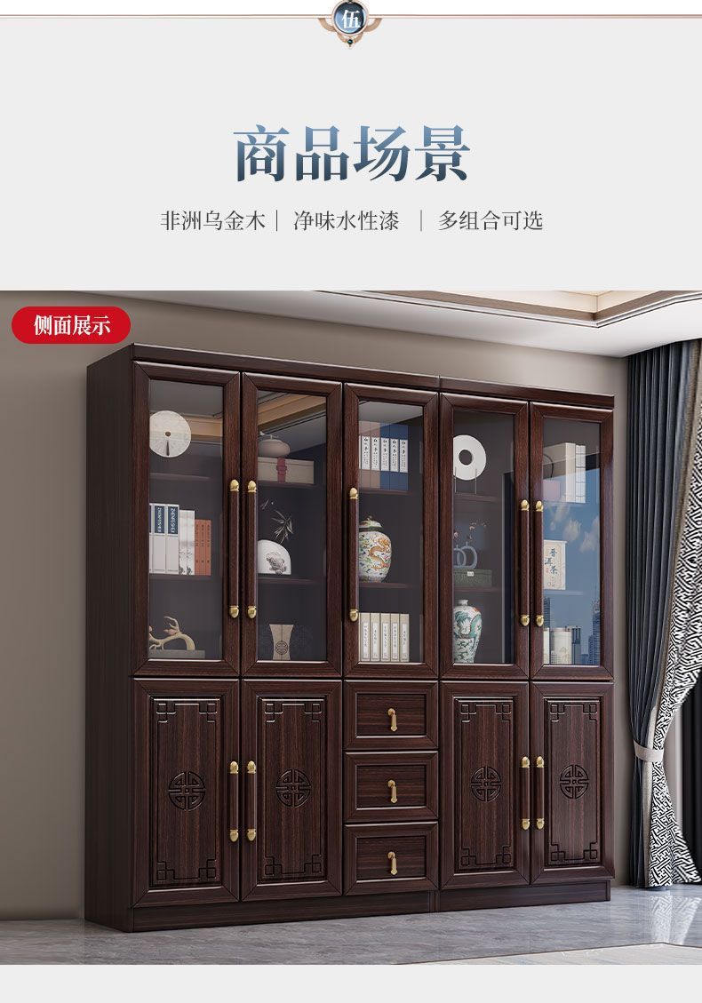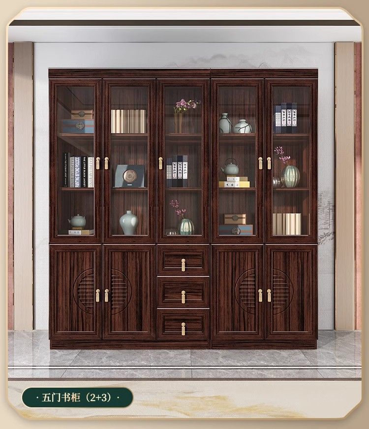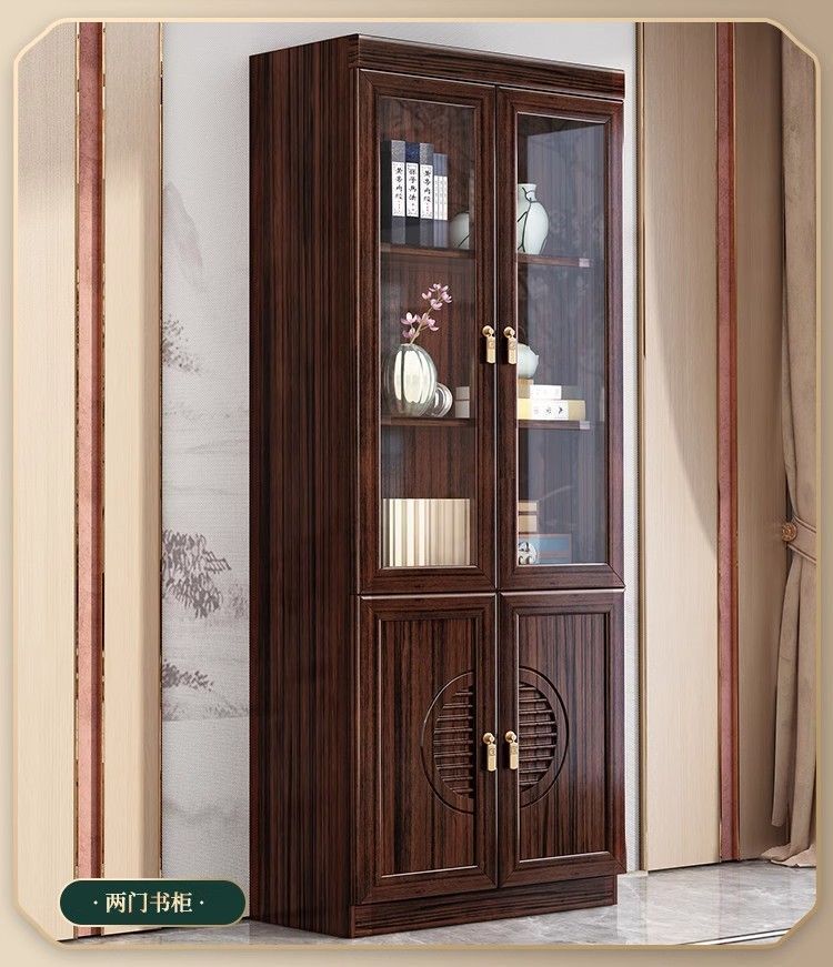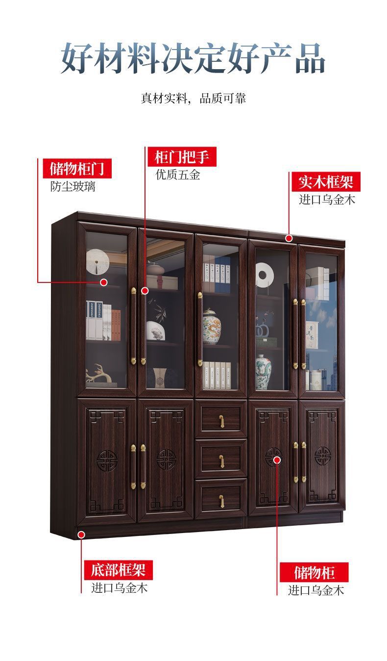 乌金木新中式实木书柜带玻璃门书架一体组合展示柜家用落地储物柜