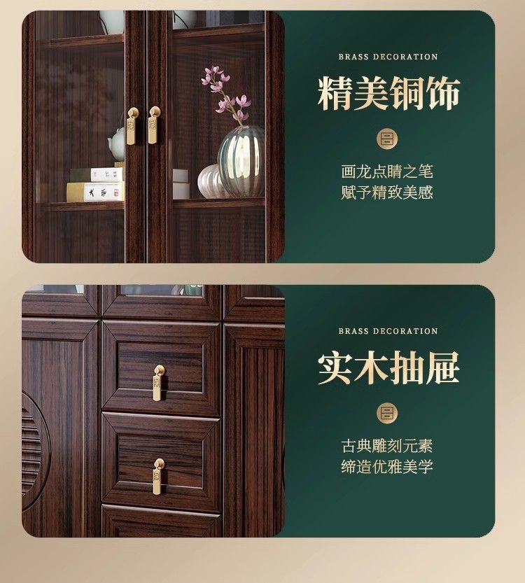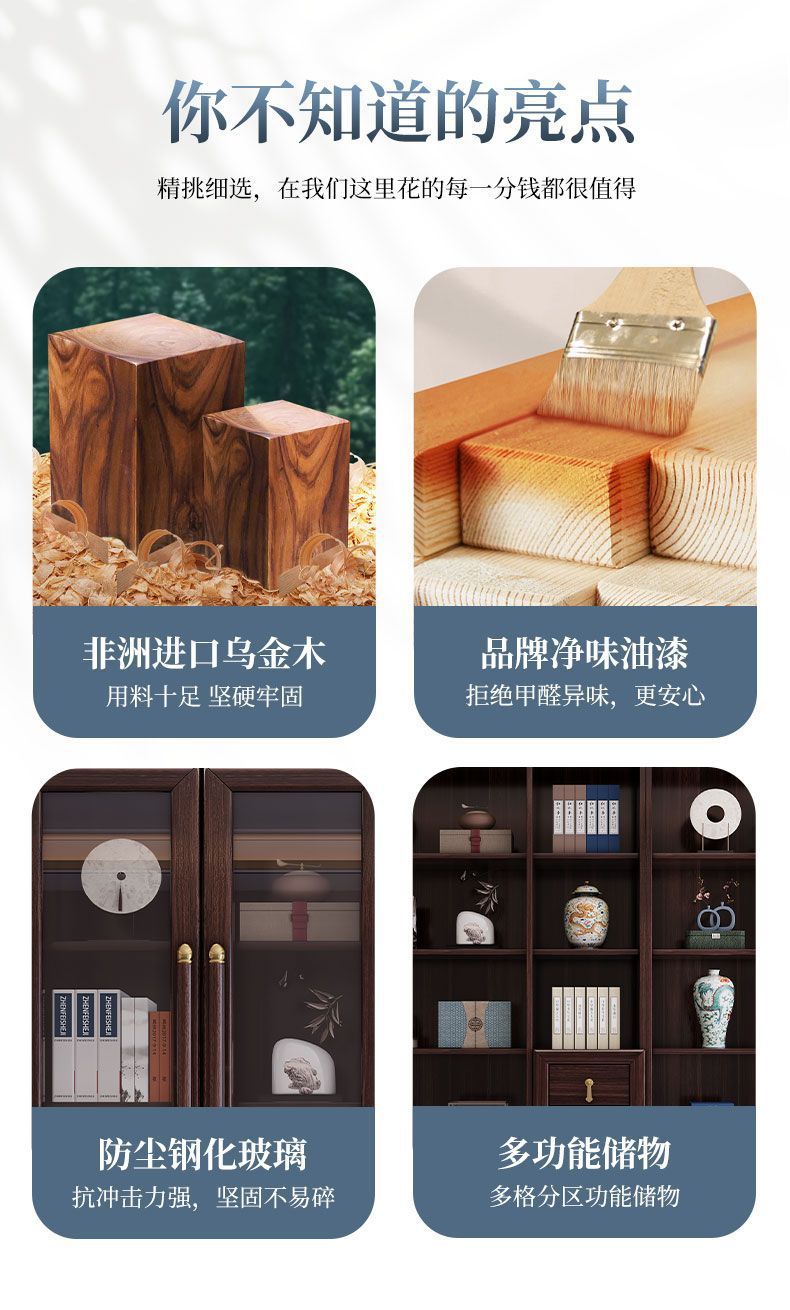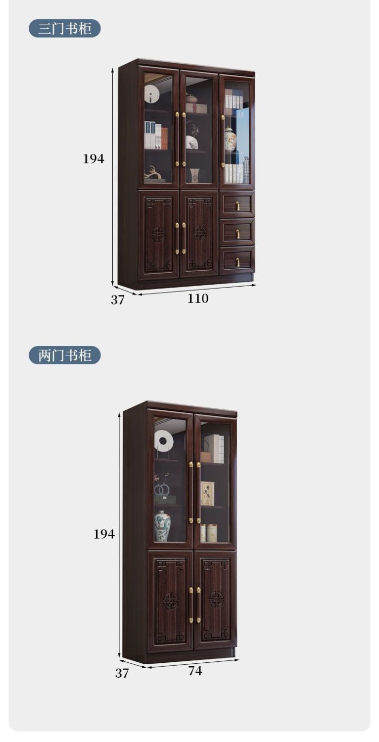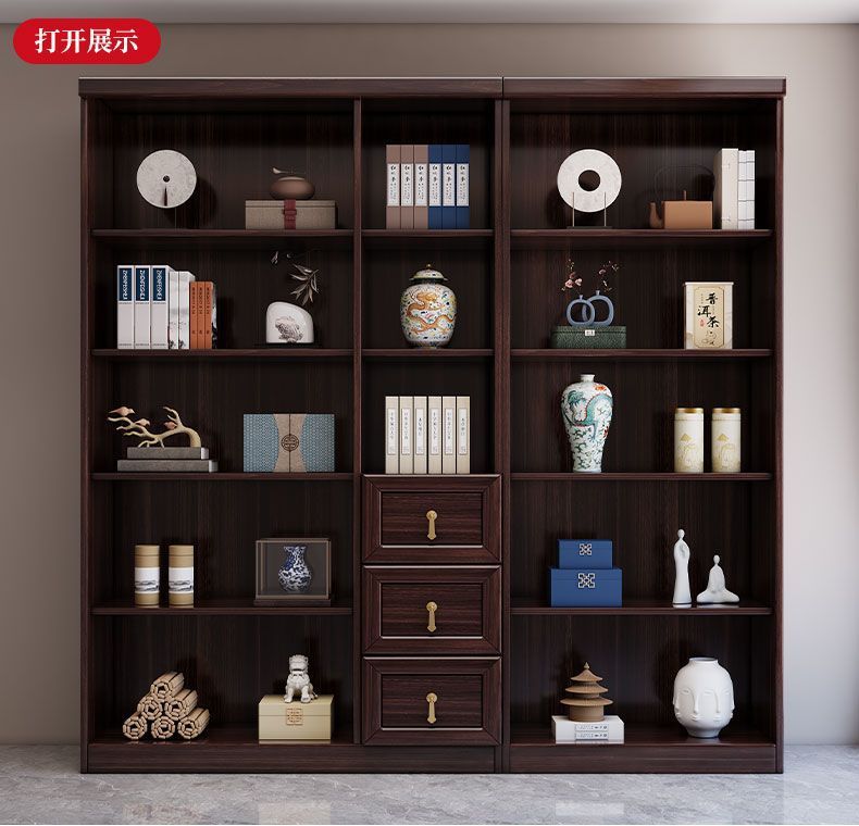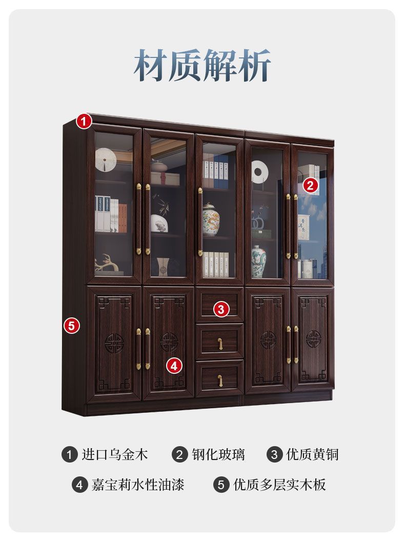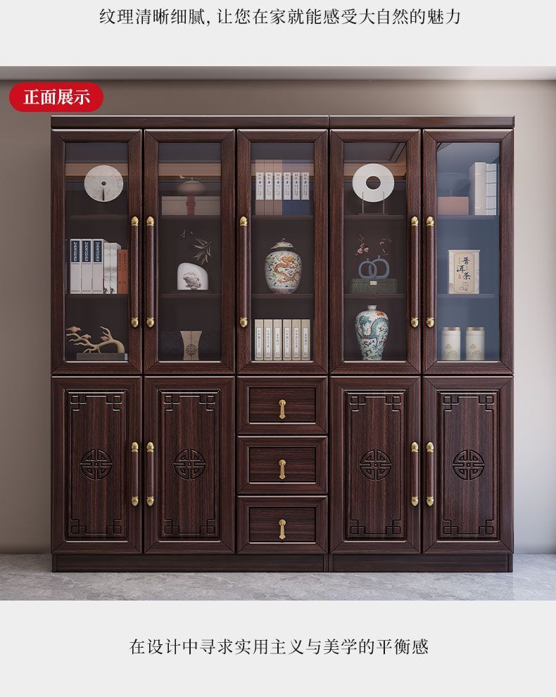 乌金木新中式实木书柜带玻璃门书架一体组合展示柜家用落地储物柜