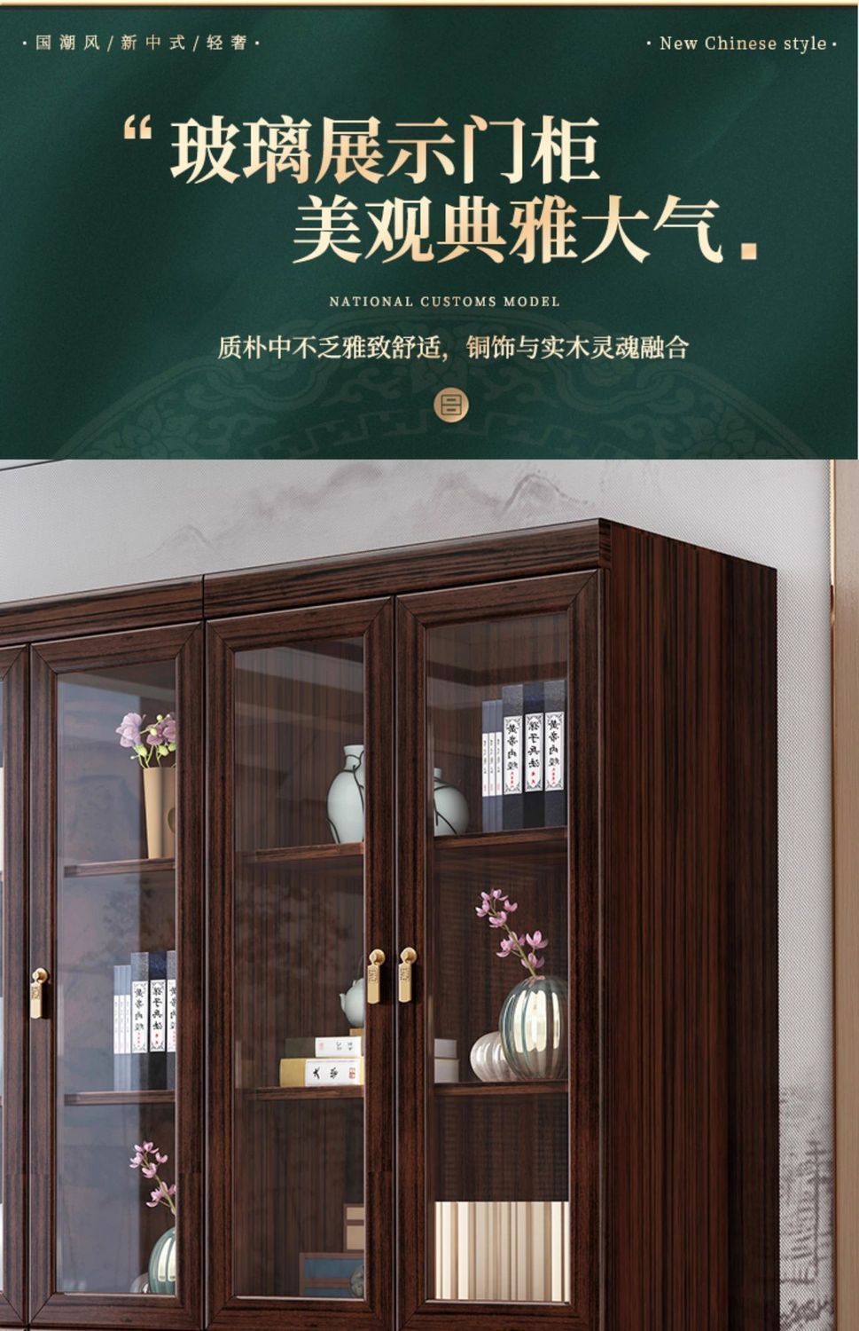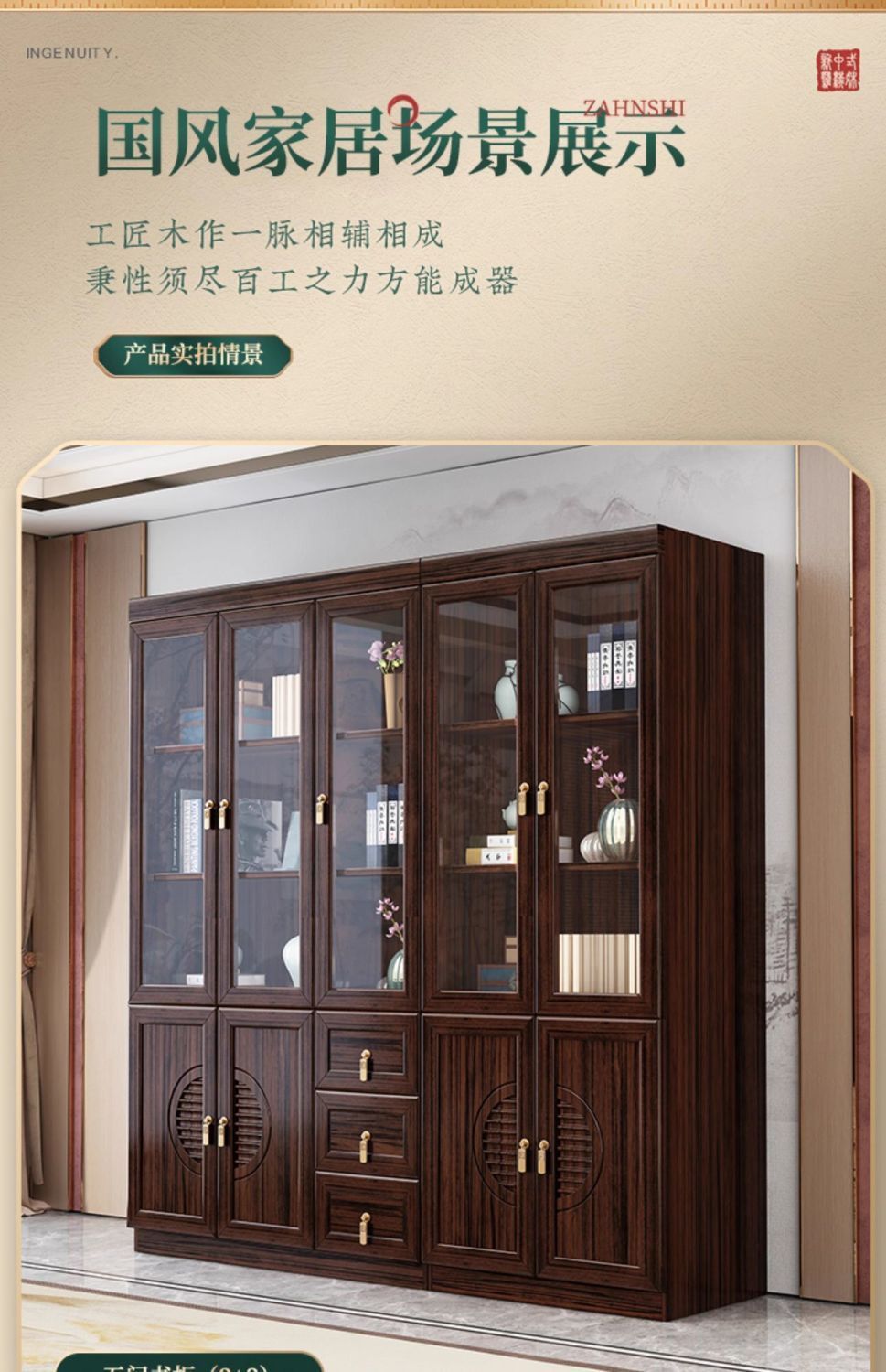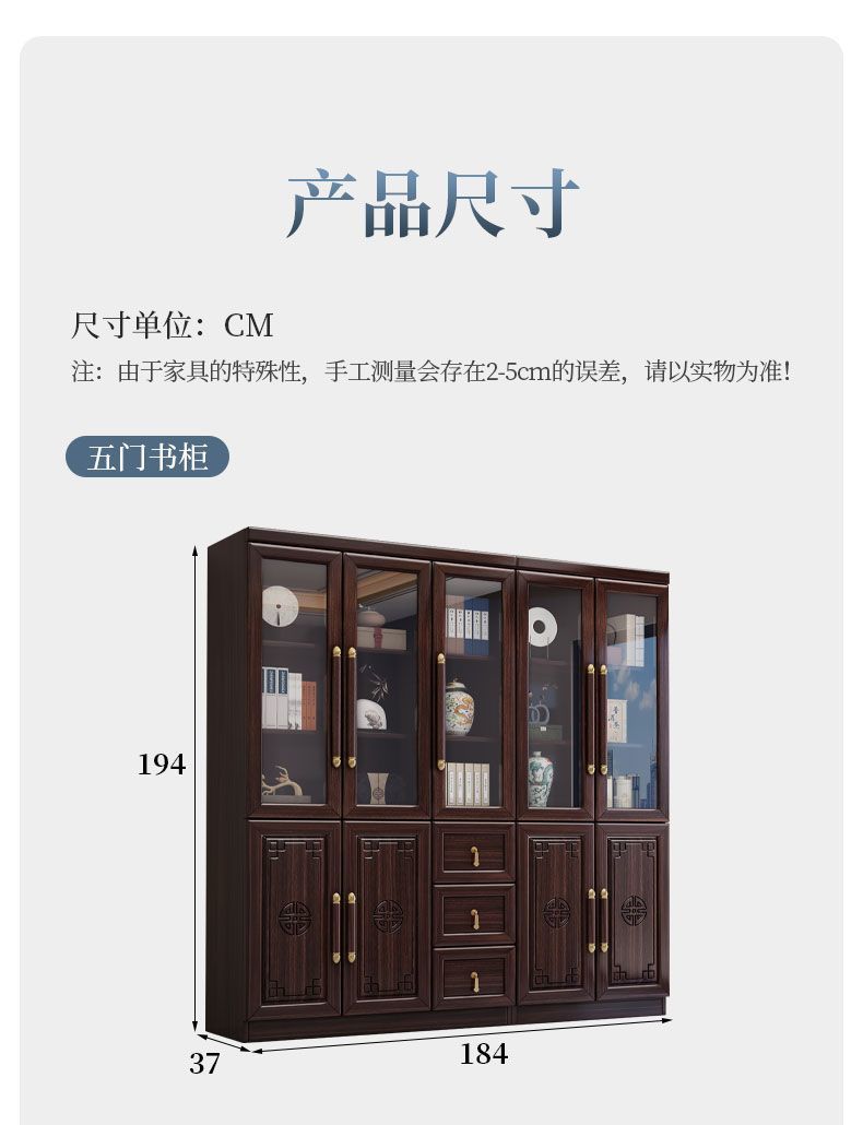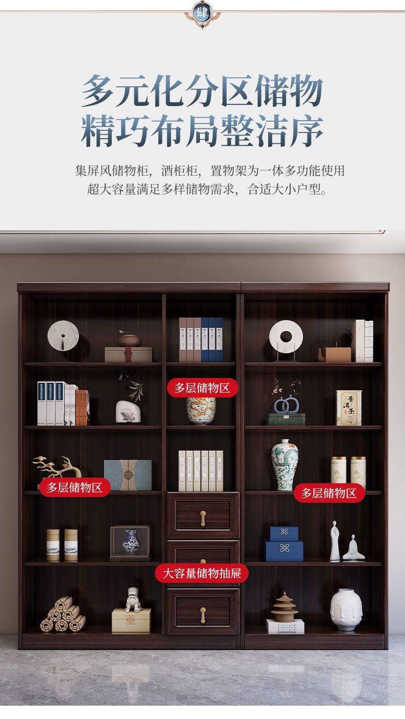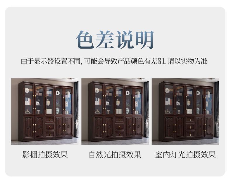 乌金木新中式实木书柜带玻璃门书架一体组合展示柜家用落地储物柜