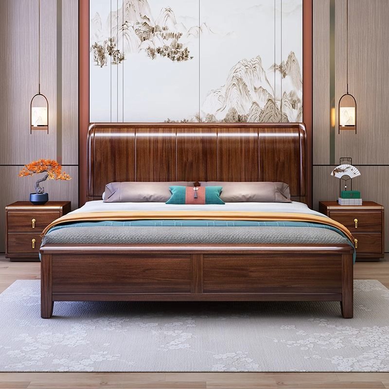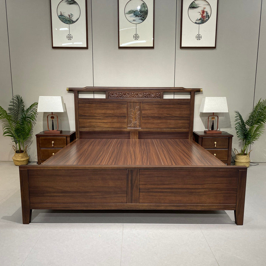 ウォールナット無垢材ベッドモダンシンプルホームマスターベッドルームほぞ穴構造ダブルベッドハイエンド中国風 1.8m ウェディングベッド