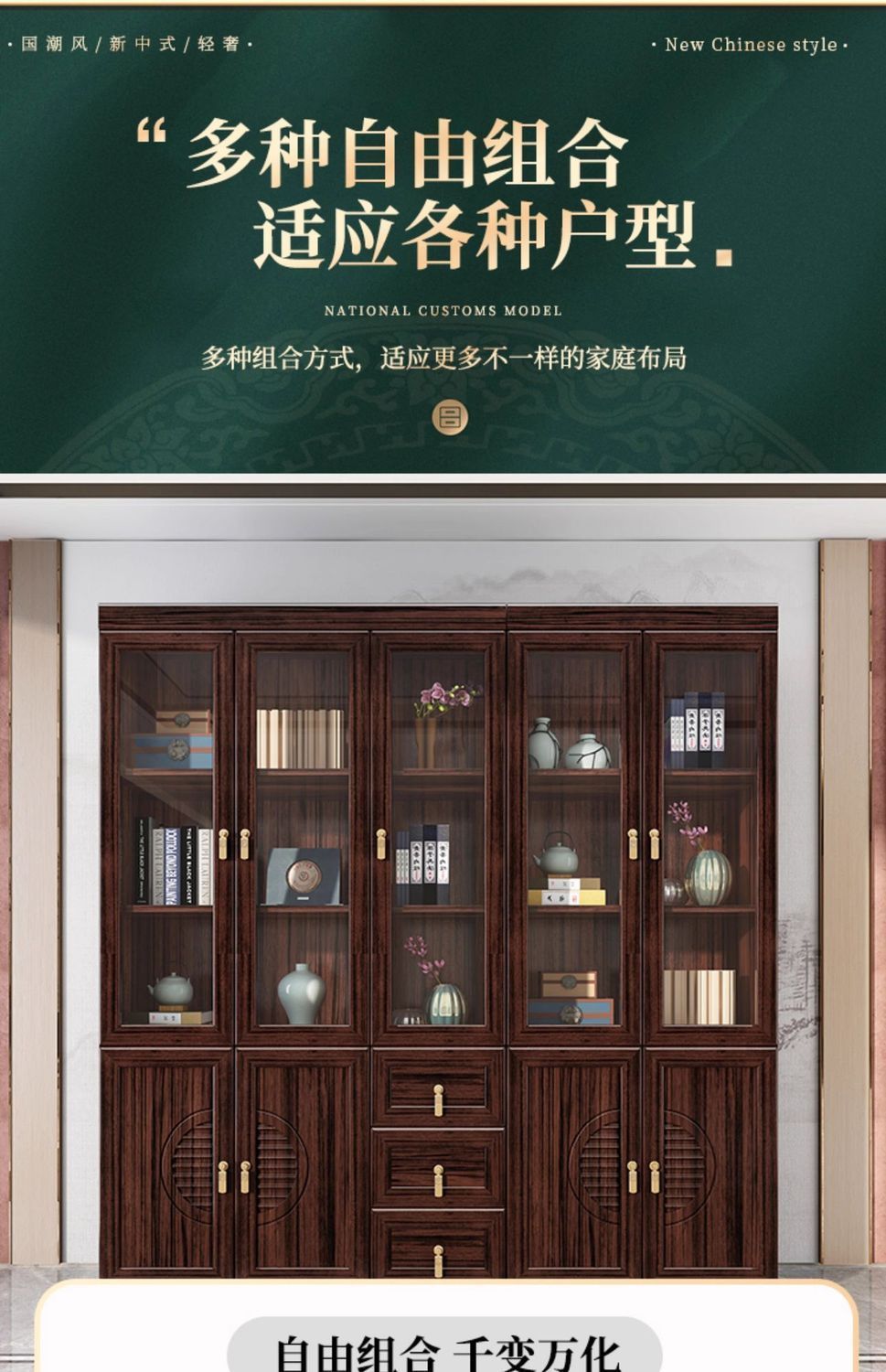 新中国式実木本棚二門三門自由組合せガラス扉付き本棚書斎戸棚卸売り