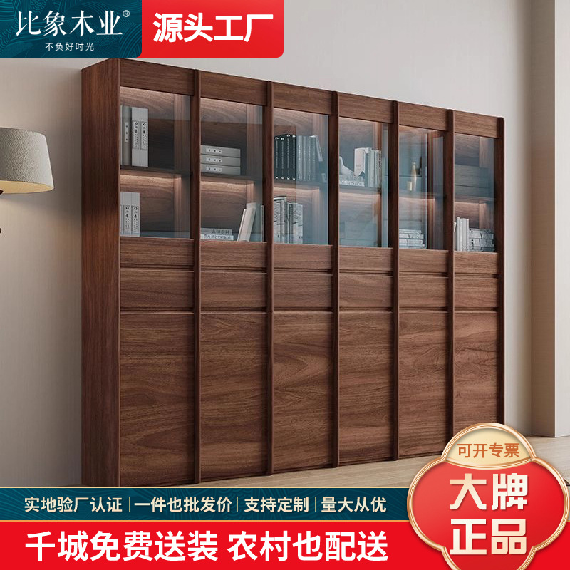 オール無垢材本棚組み合わせガラス防塵フリップドア床置きブラックウォールナット本棚一体型壁リビングルーム収納キャビネット