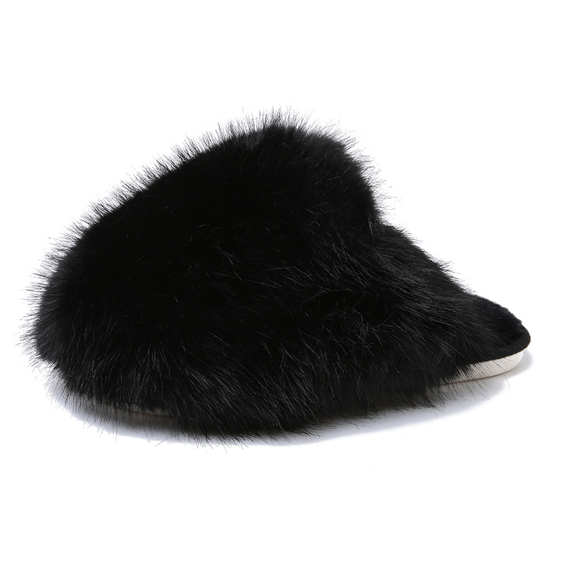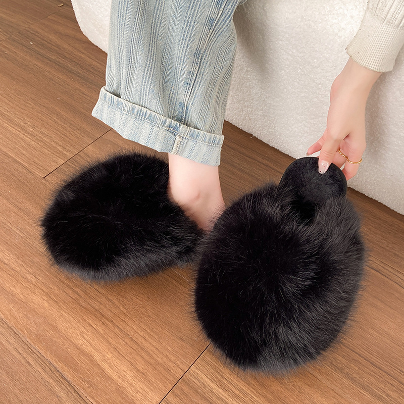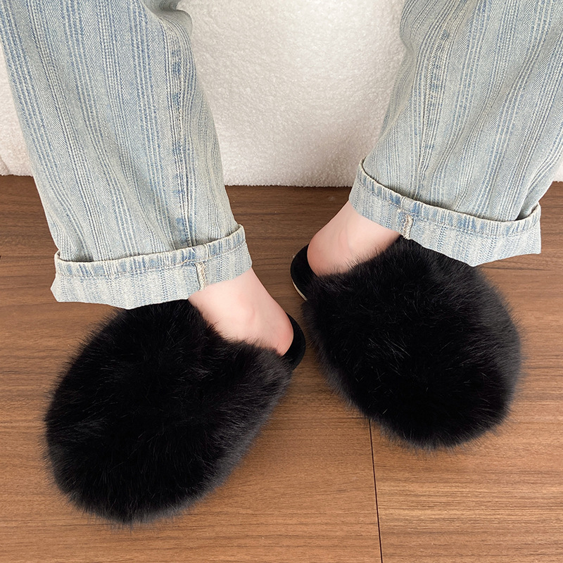 外贸大码纯色蓬松毛毛拖鞋一脚蹬软底平底鞋冬季包头家居保暖