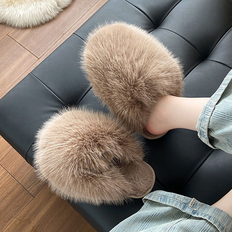 秋の毛のスリッパの女性は2024の新型の高級感の平底の快適な綿のスリッパの大きいサイズの交差の毛を着ます。