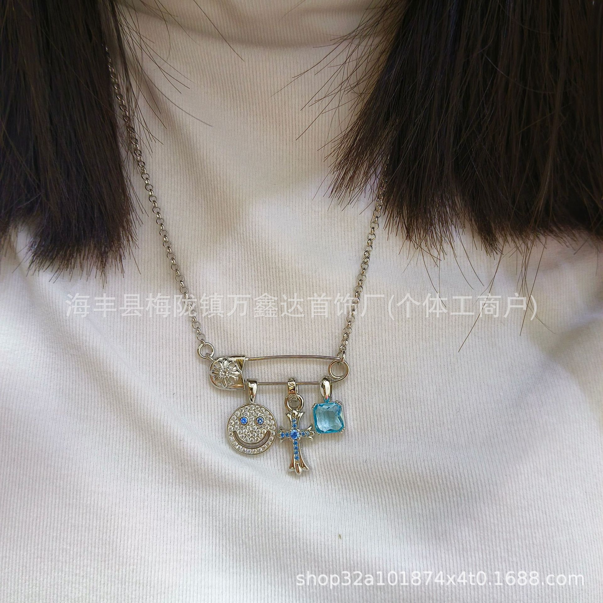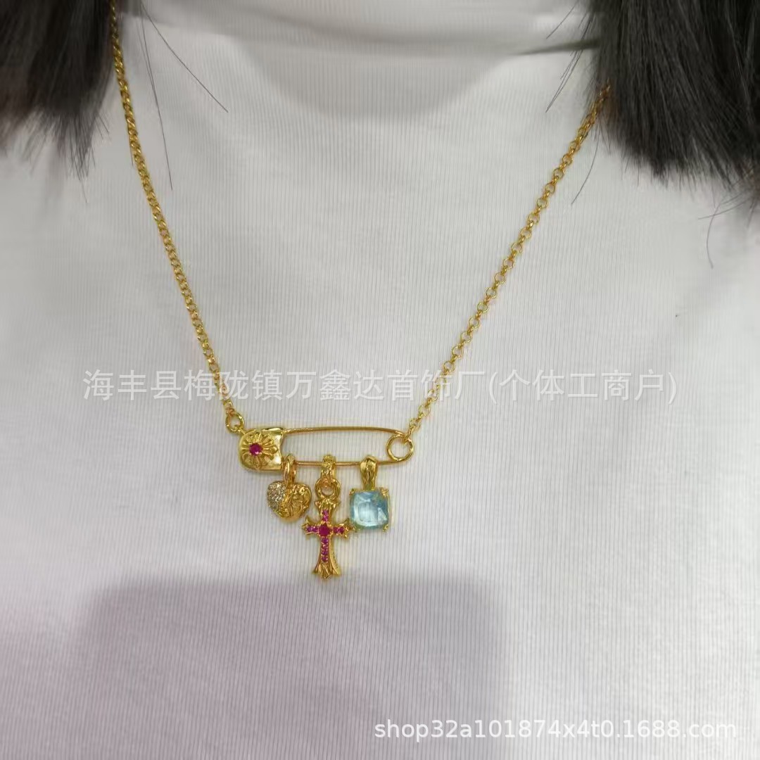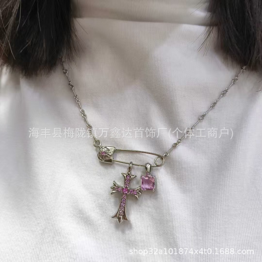 克罗伈新款镶钻双十字架回形扣别针锁骨链高级感欧美小众日常配饰