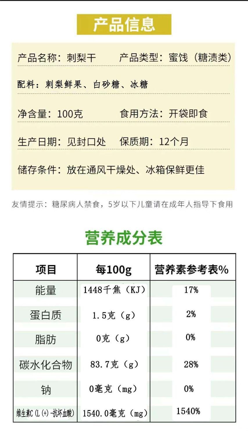 包装规格 100g*1袋【刺梨干】,100g*2袋【刺梨干】,100g*3袋【刺梨干】,100g*5袋【刺梨干】
