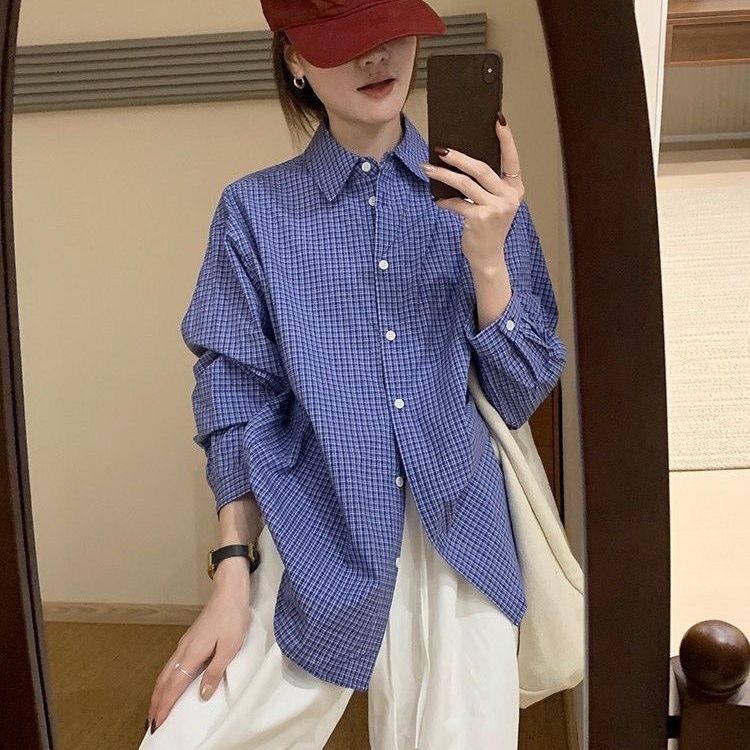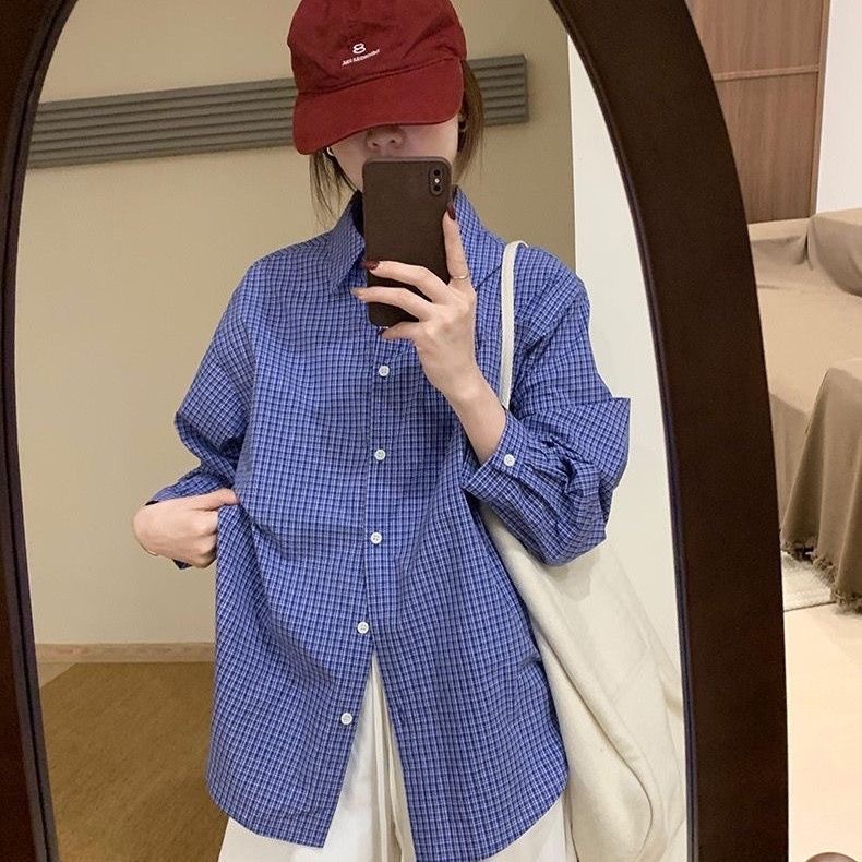 美式慵懒宽松蓝色格子衬衫女春秋季休闲百搭复古长袖衬衣叠穿上衣