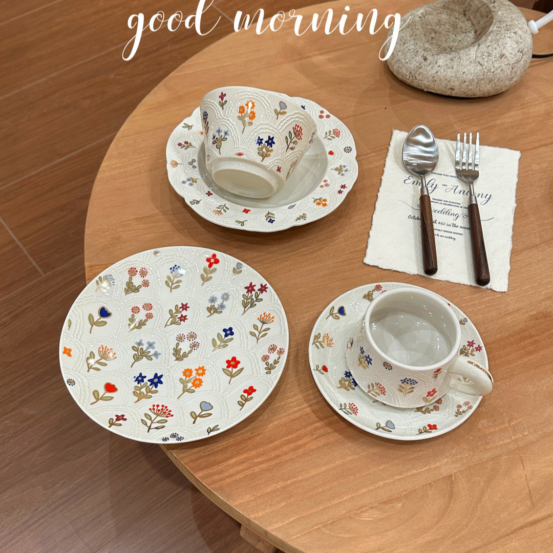 フレンチミッドセンチュリーホリデーロマンチックローズマナー エンボスフラワーセラミックプレートボウル デザートプレート スーププレート 食器セット
