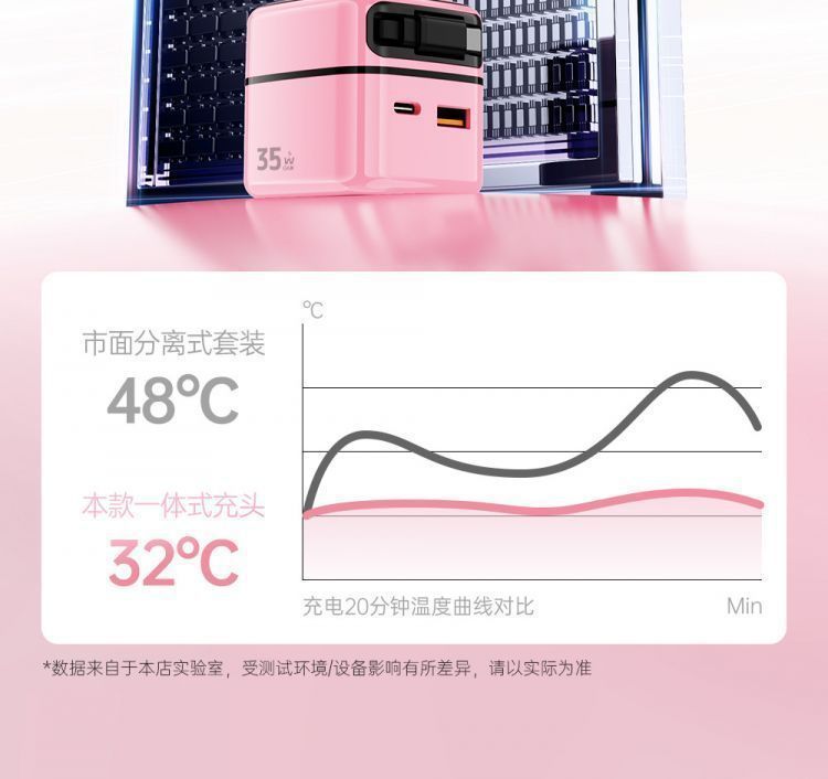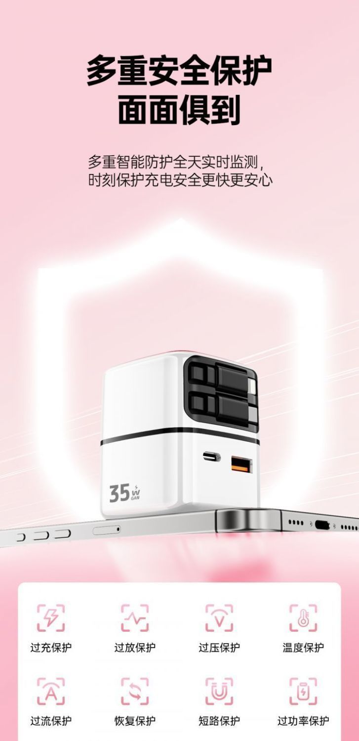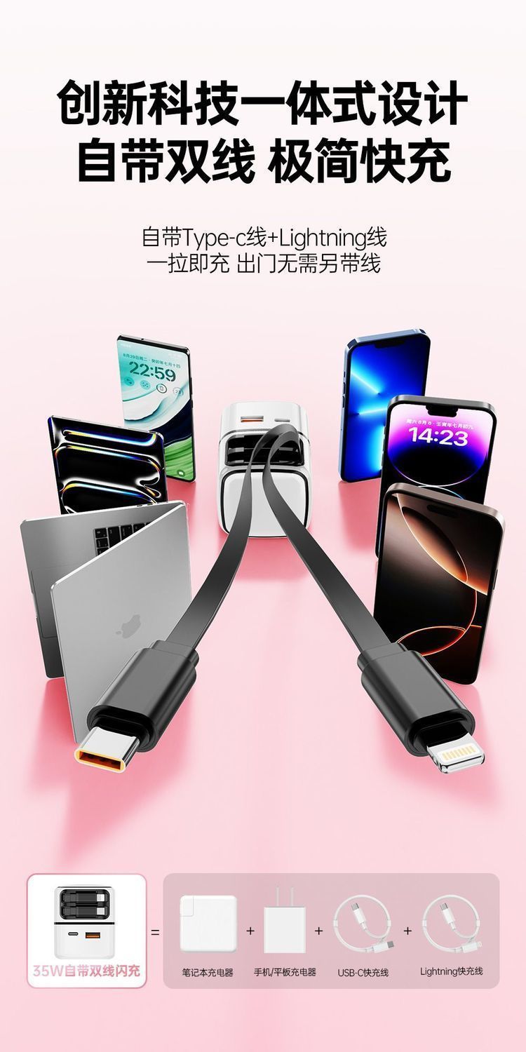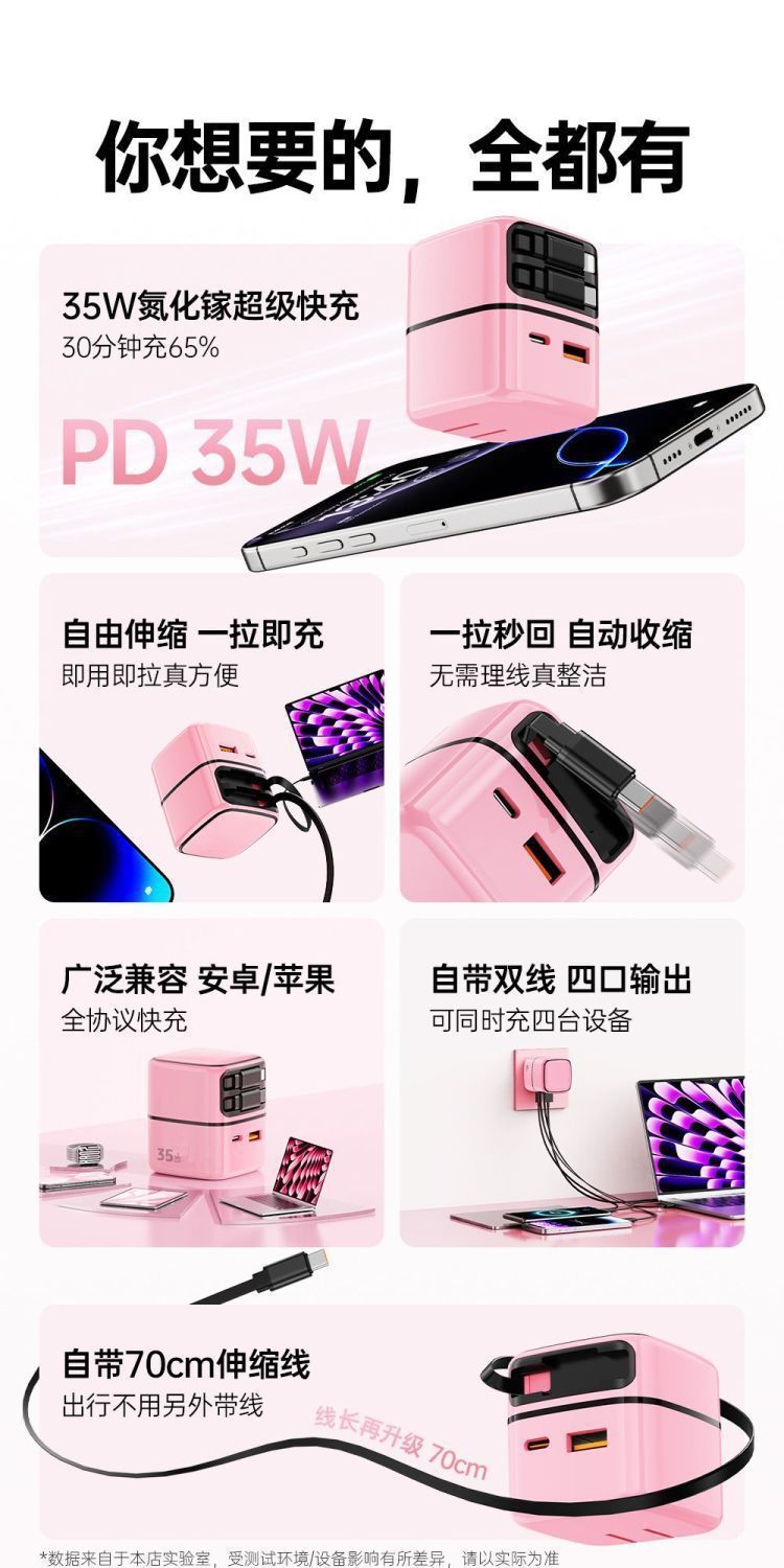 PD35W氮化镓四口快充头自带双伸缩线笔记本手机平板全兼容充电器