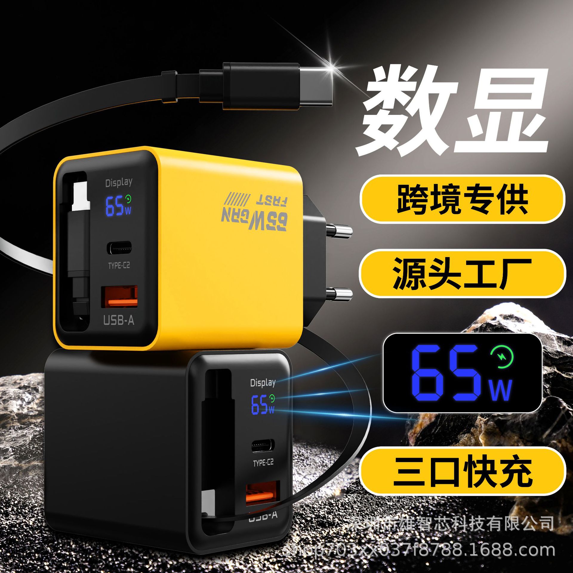 跨境65w数显充电器 自带伸缩线 适用苹果手机充电头 氮化镓充电器
