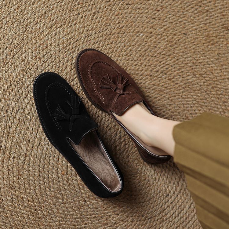 小革靴英倫風羊皮楽福靴女2024春秋タイプの丸首一足流蘇平とカジュアルシューズ