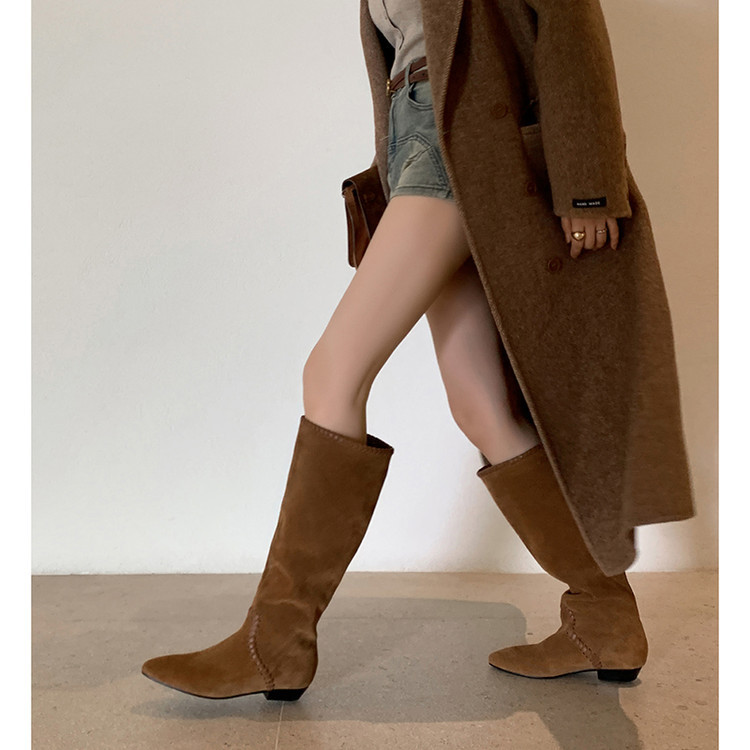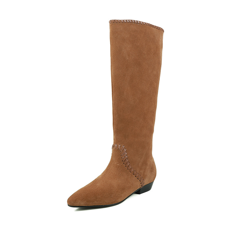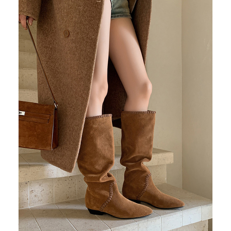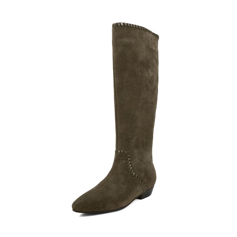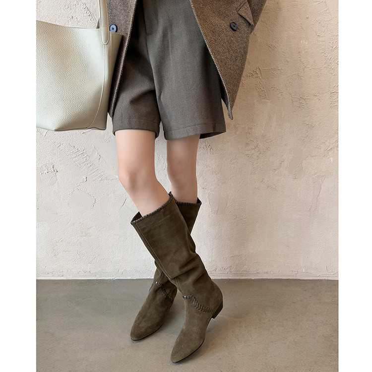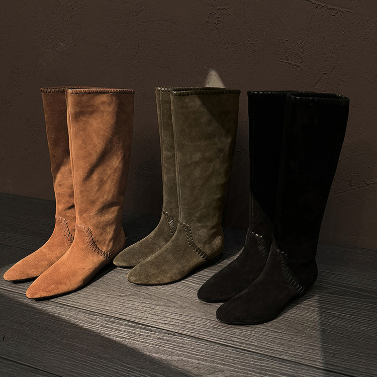 高丝光牛皮西部靴女骑士靴冬新款真皮圆头低跟不过膝长靴女高筒靴