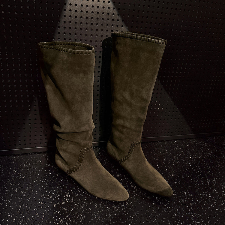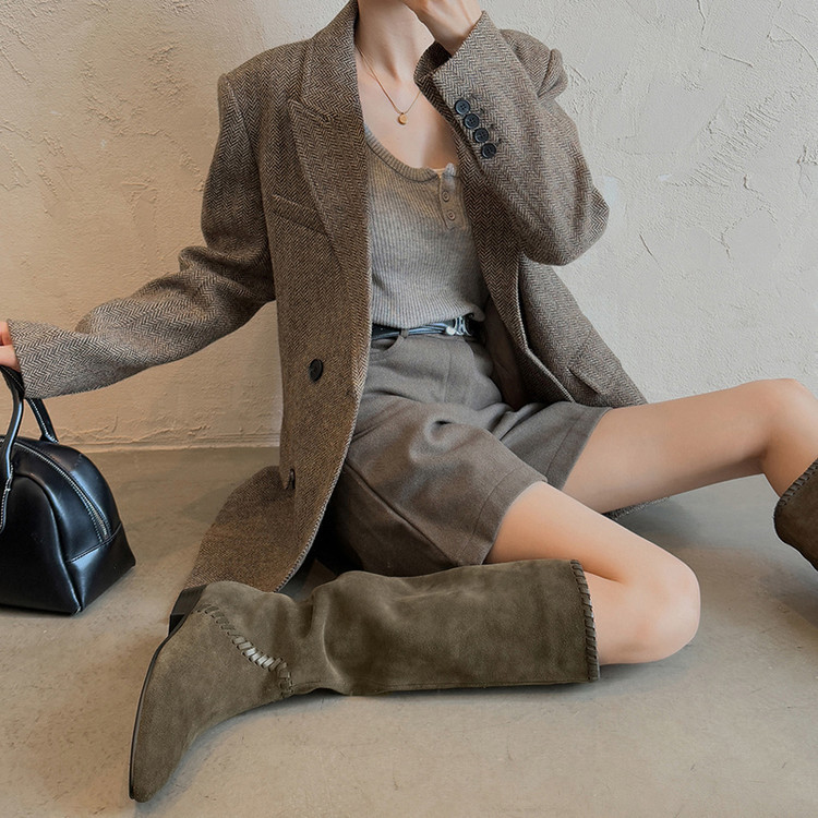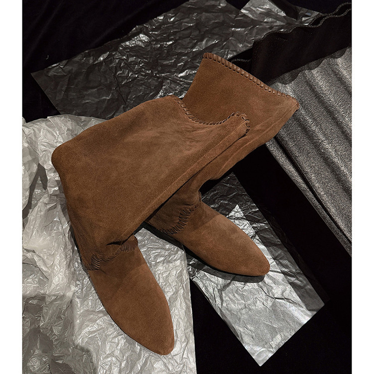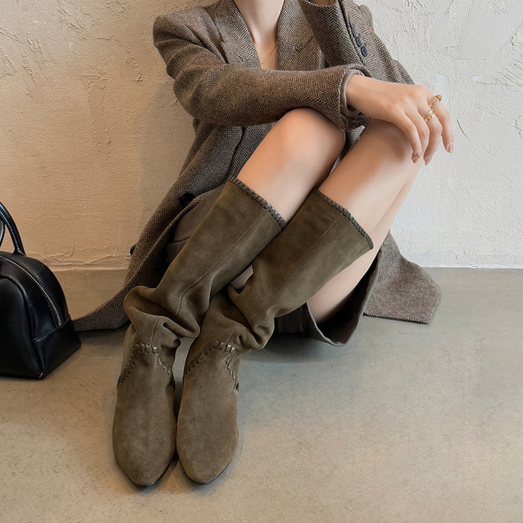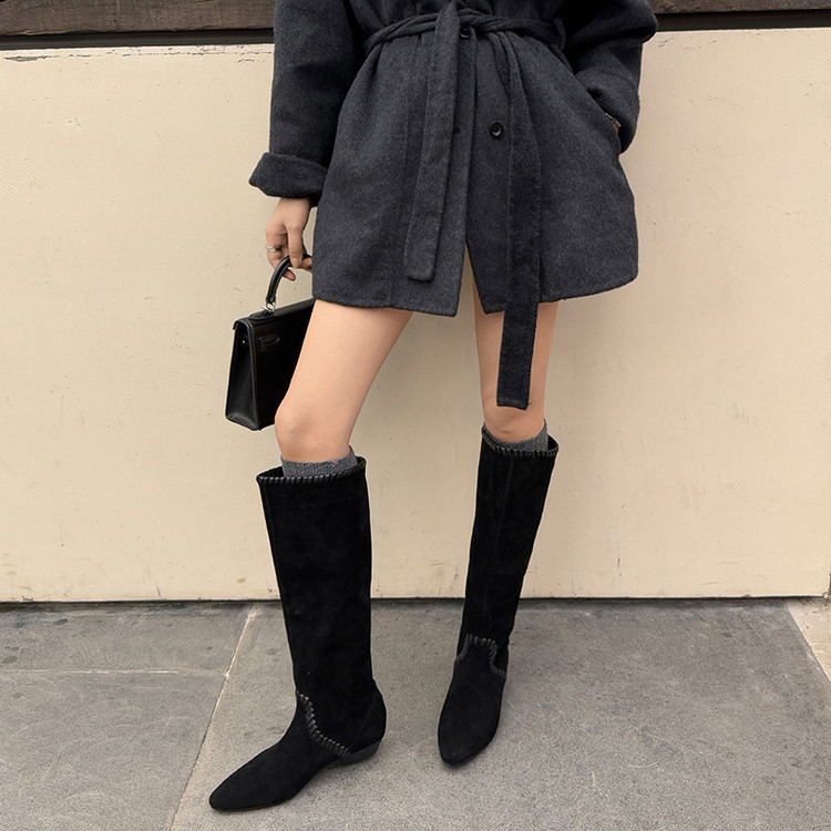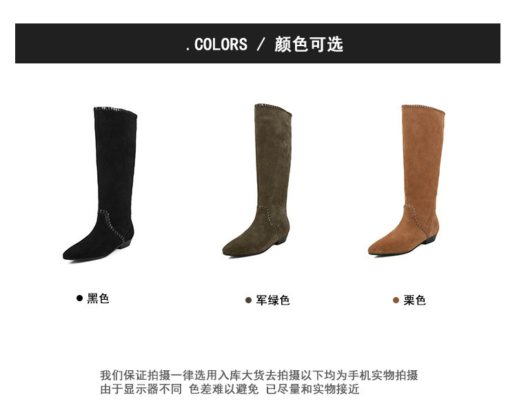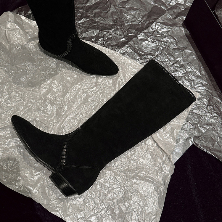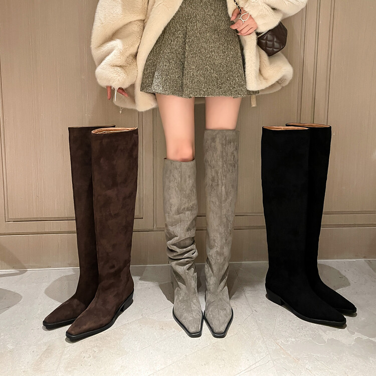 两穿过膝靴女高筒长靴子秋冬新款牛翻皮方头粗中跟套筒骑士靴女靴