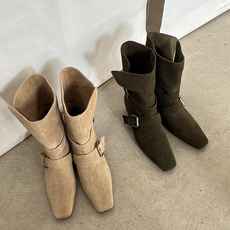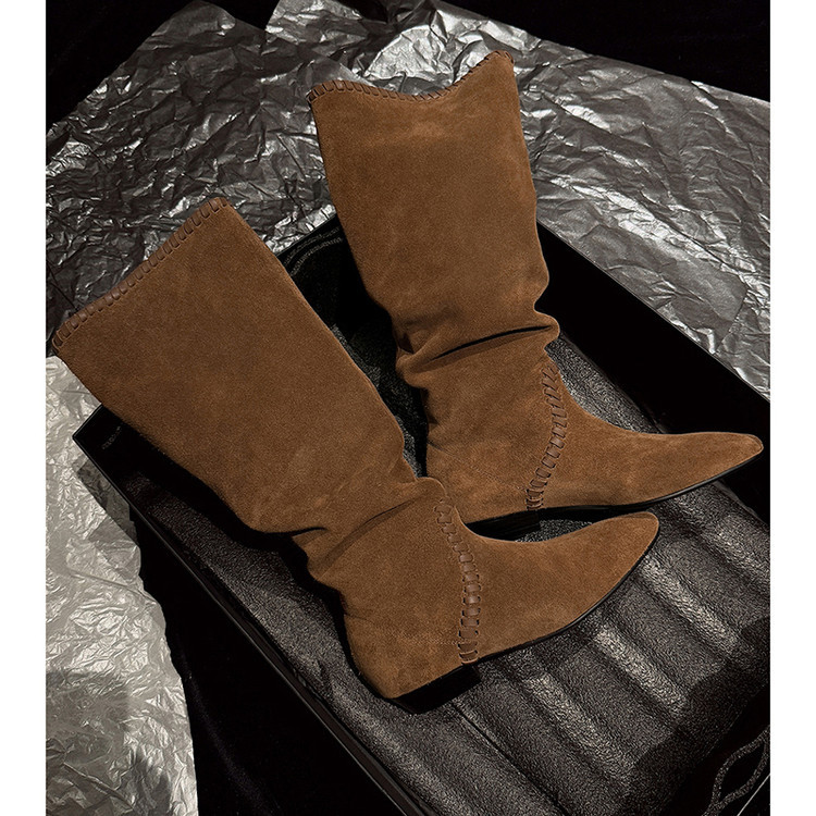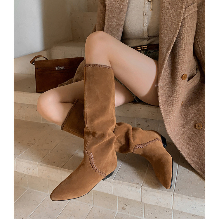 欧米風ワイドブーツ女性カジュアルブーツ秋冬新商品本革レトロ角頭スリーブ低ヒール女性用ミドルブーツ