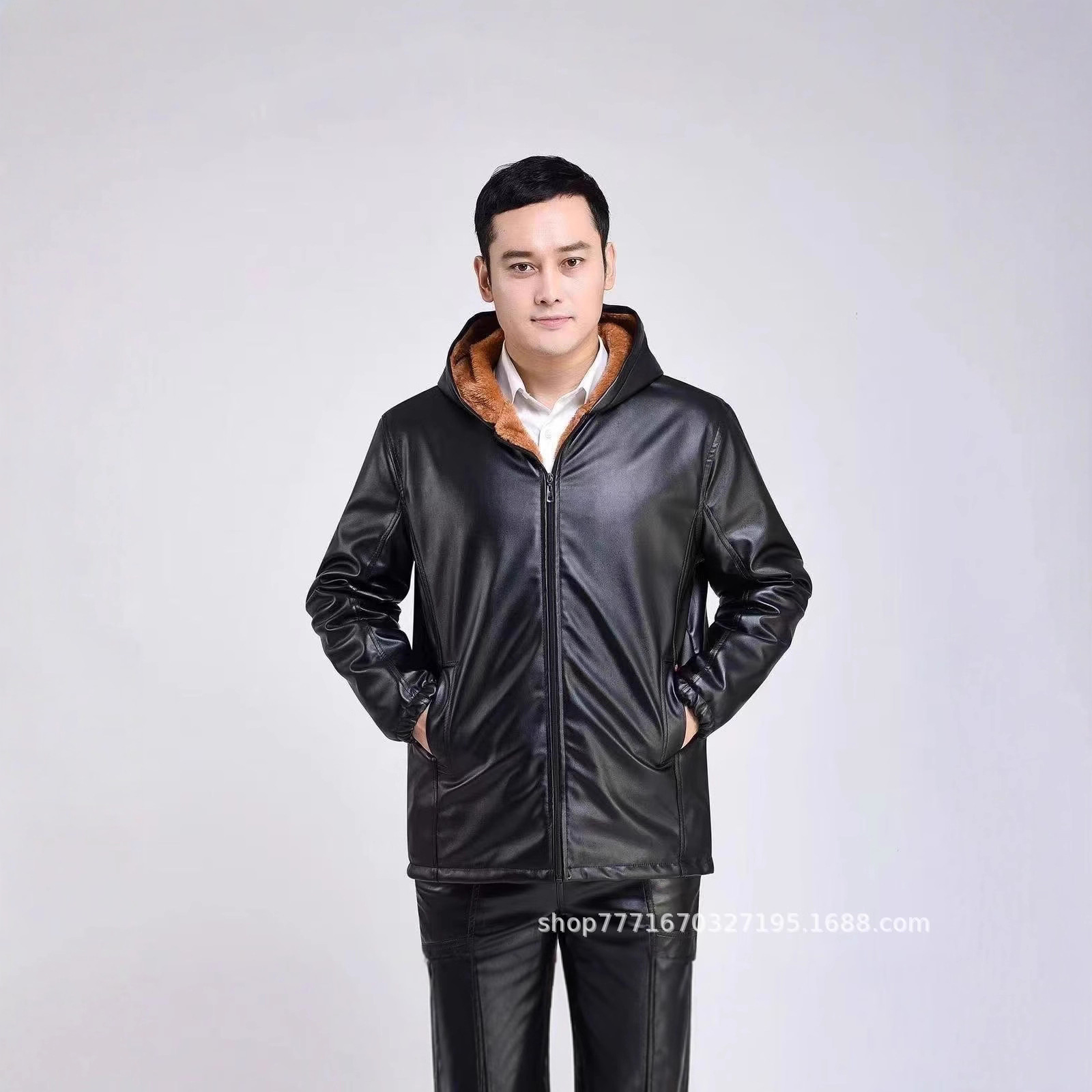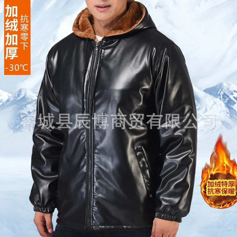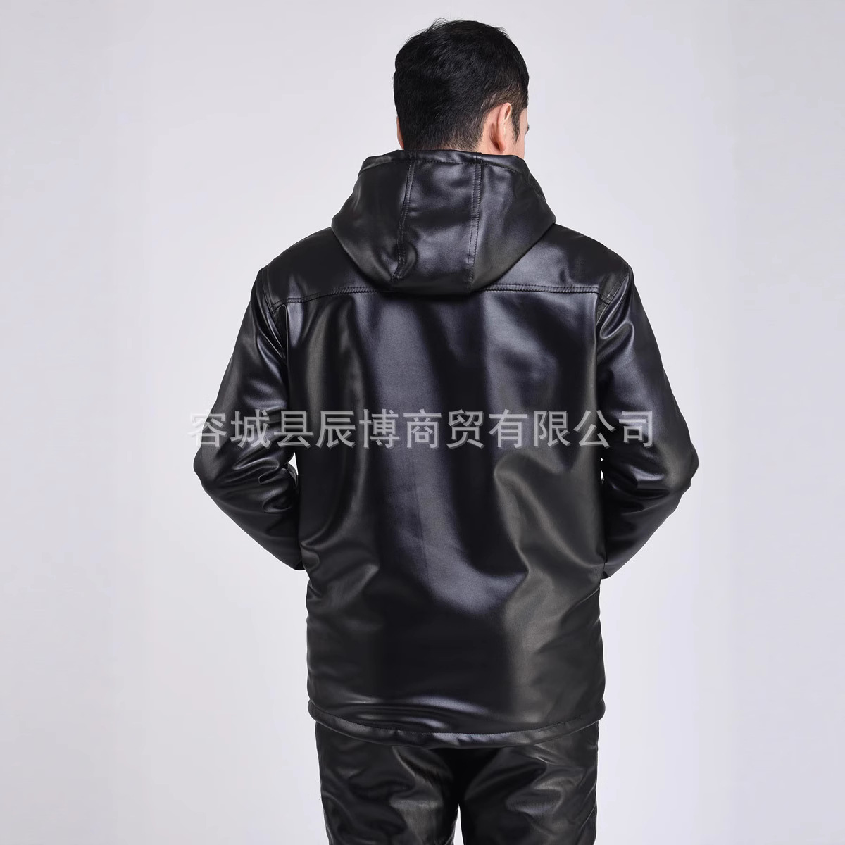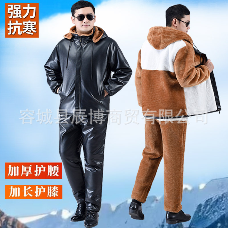 加绒加厚拆帽皮衣皮裤皮套装男保暖冷库工作服宽松防水皮棉衣外套