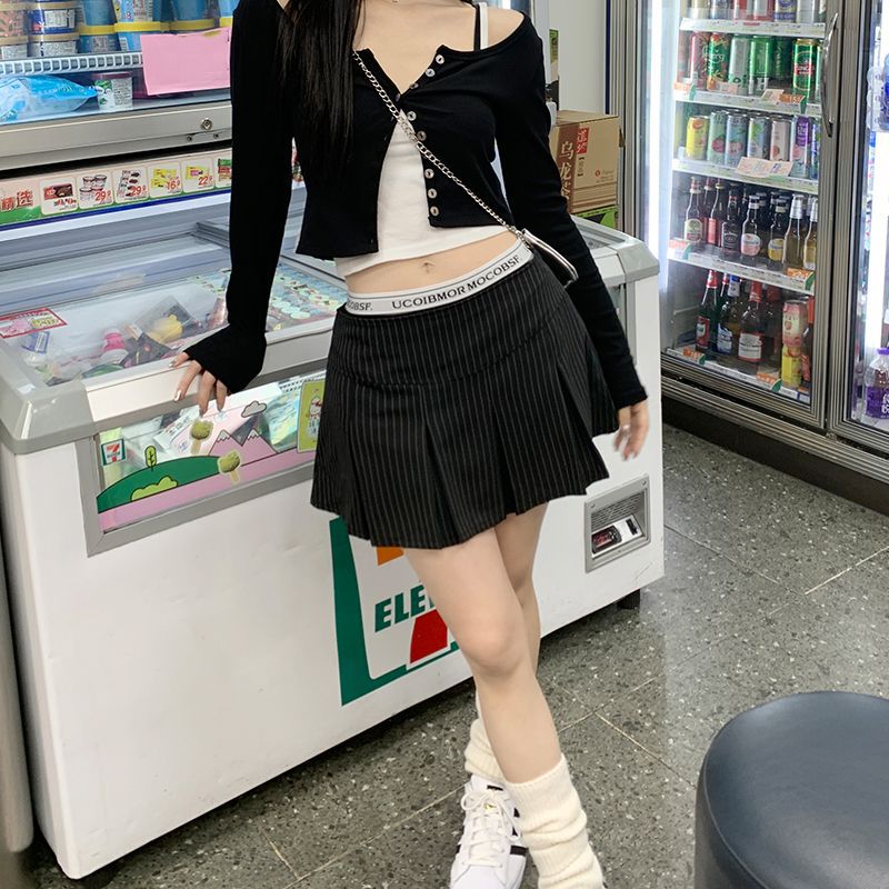 縦縞の黒いプリーツのスカートの女性の夏の高腰はやせています。