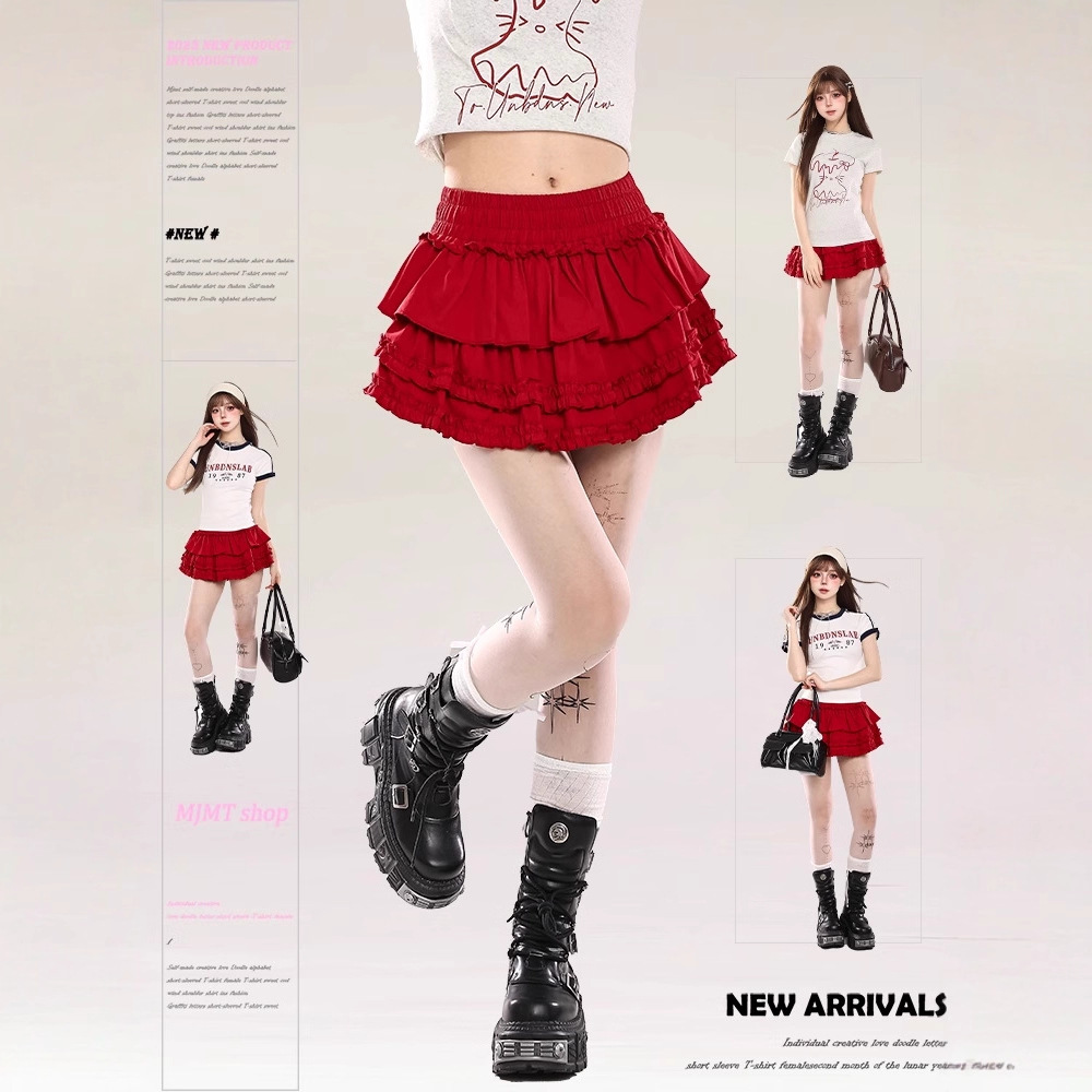 甜辣妹红色木耳边蓬蓬蛋糕裙女夏季新款芭蕾风高腰显瘦小个子短裙
