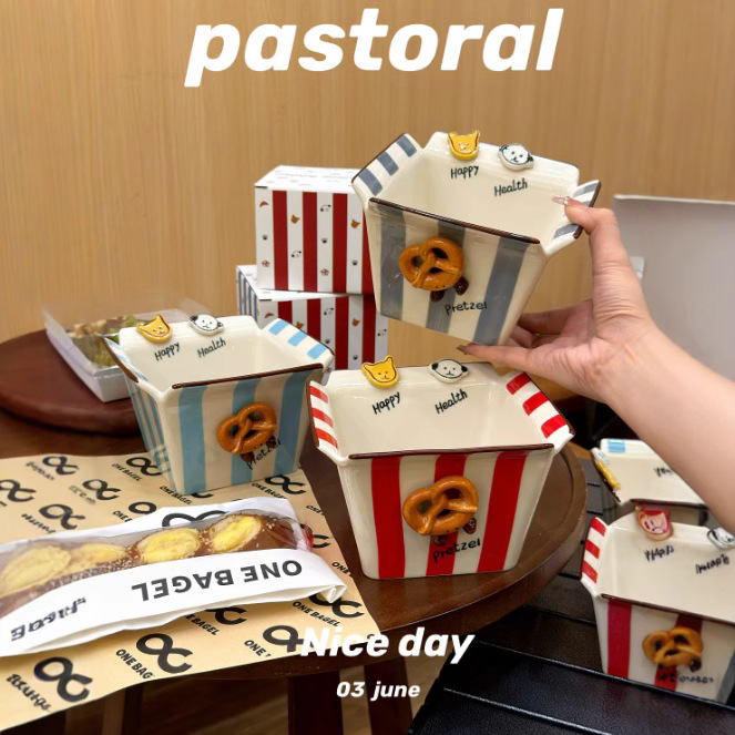 新しいinsシンプルで見栄えの良いボタン子犬スクエアフライドポテトボウルドラマフルーツスナックボウルサラダインスタントラーメンボウル