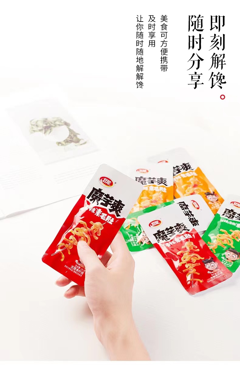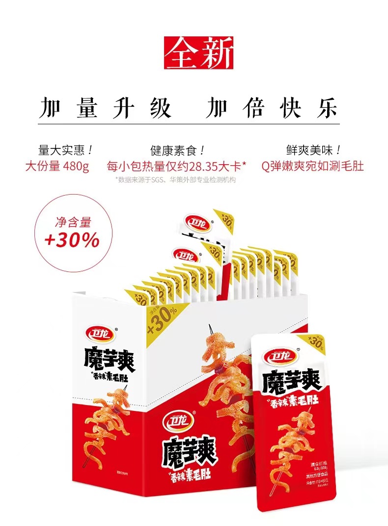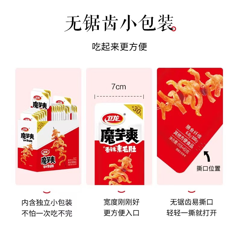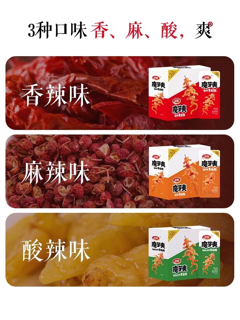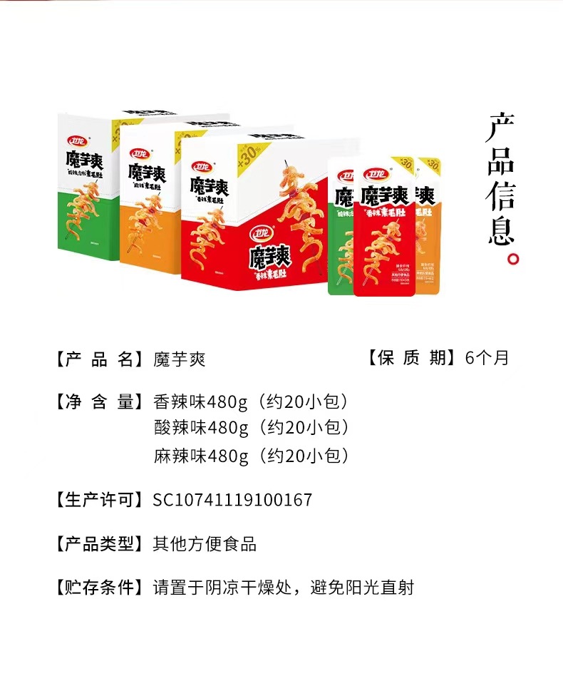 包装规格 18克香辣魔芋爽(20包一盒),18克麻辣魔芋爽(20包一盒),18克酸辣魔芋爽(20包一盒),18克麻酱魔芋爽(20包一盒),15克爆辣魔芋爽,香辣味24克亲嘴烧(20包一盒),川香味24克亲嘴烧(20包一盒),麦辣味24克亲嘴烧(20包一盒),牛肉味24克亲嘴烧(20包一盒),24克大面筋(20包一盒),烤肉味24克大面筋(20包一盒),24克小面筋(20包一盒),烤肉味24克小面筋(20包一盒),24克麻辣麻辣(20包一盒),24克小麻小辣(20包一盒)