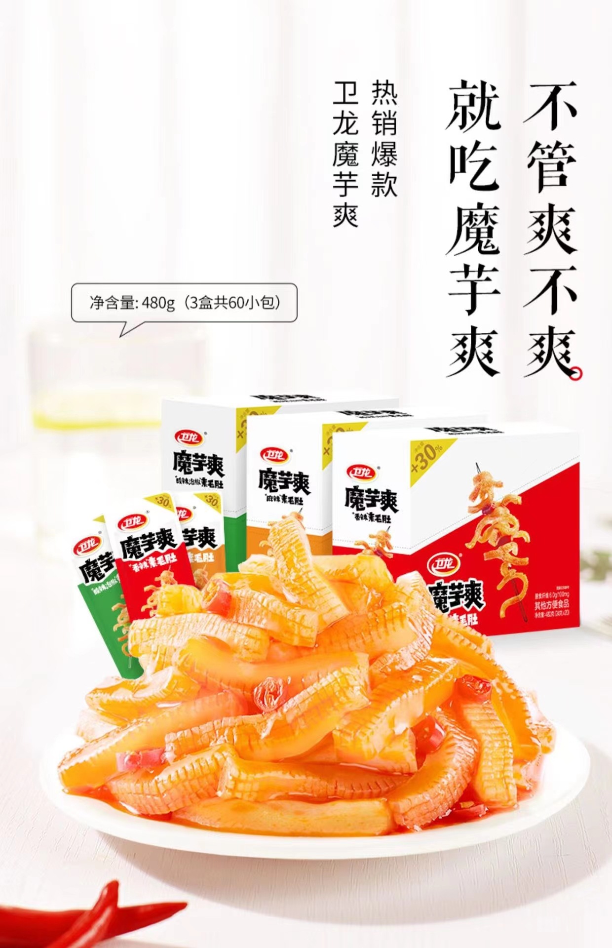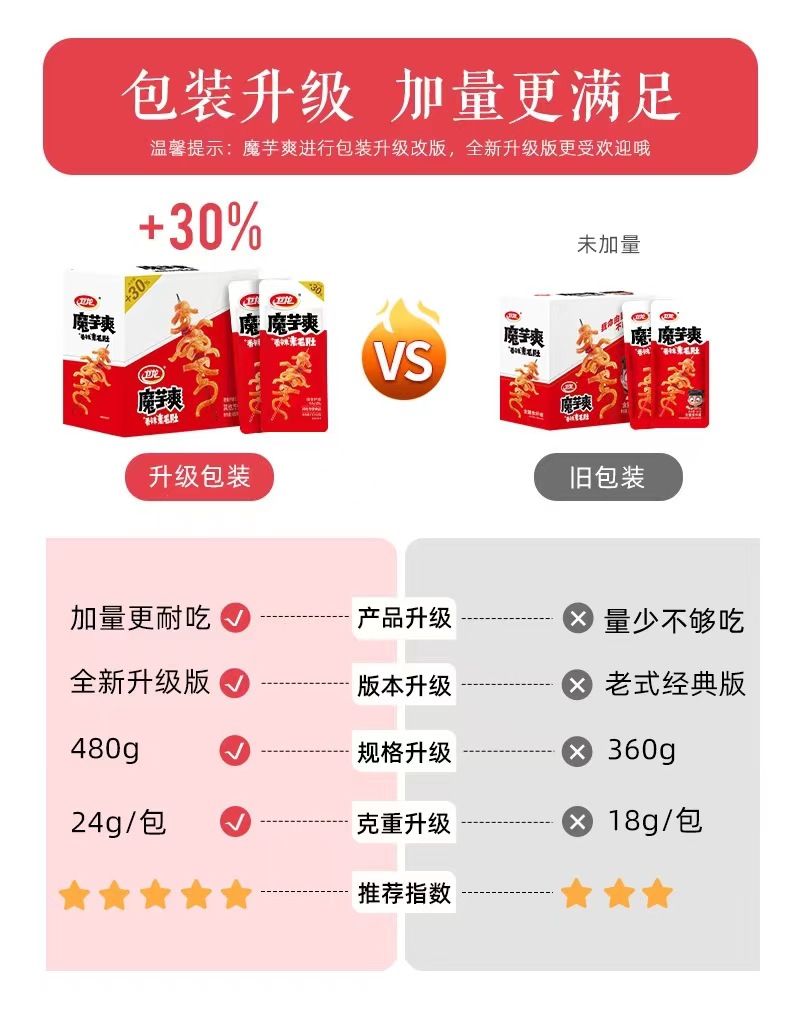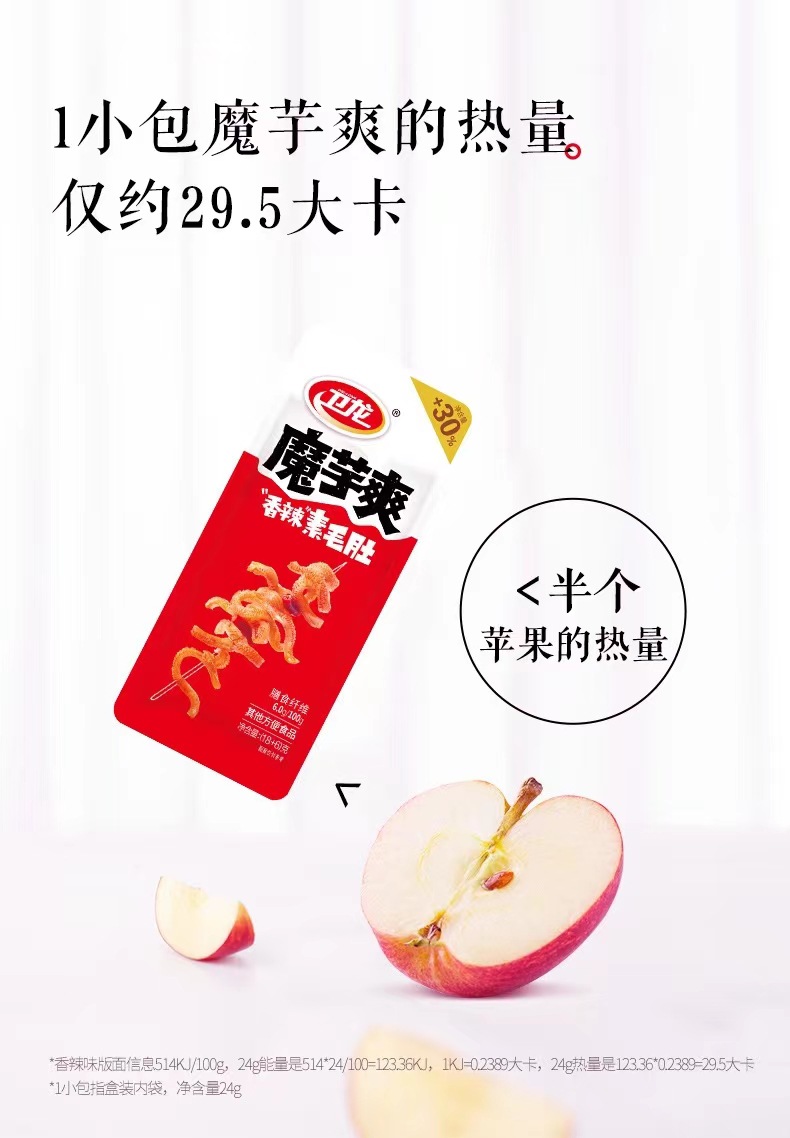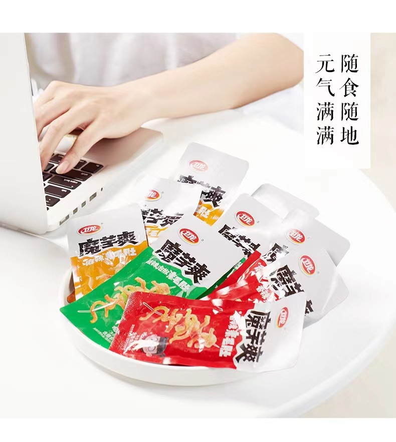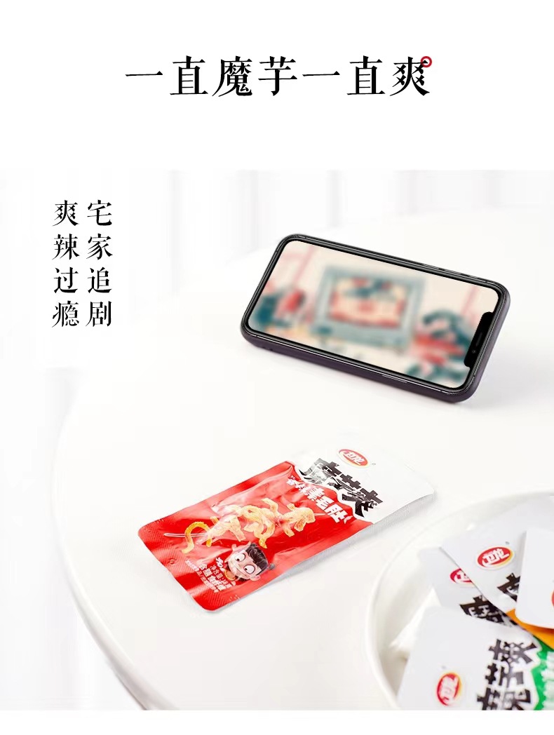 包装规格 18克香辣魔芋爽(20包一盒),18克麻辣魔芋爽(20包一盒),18克酸辣魔芋爽(20包一盒),18克麻酱魔芋爽(20包一盒),15克爆辣魔芋爽,香辣味24克亲嘴烧(20包一盒),川香味24克亲嘴烧(20包一盒),麦辣味24克亲嘴烧(20包一盒),牛肉味24克亲嘴烧(20包一盒),24克大面筋(20包一盒),烤肉味24克大面筋(20包一盒),24克小面筋(20包一盒),烤肉味24克小面筋(20包一盒),24克麻辣麻辣(20包一盒),24克小麻小辣(20包一盒)