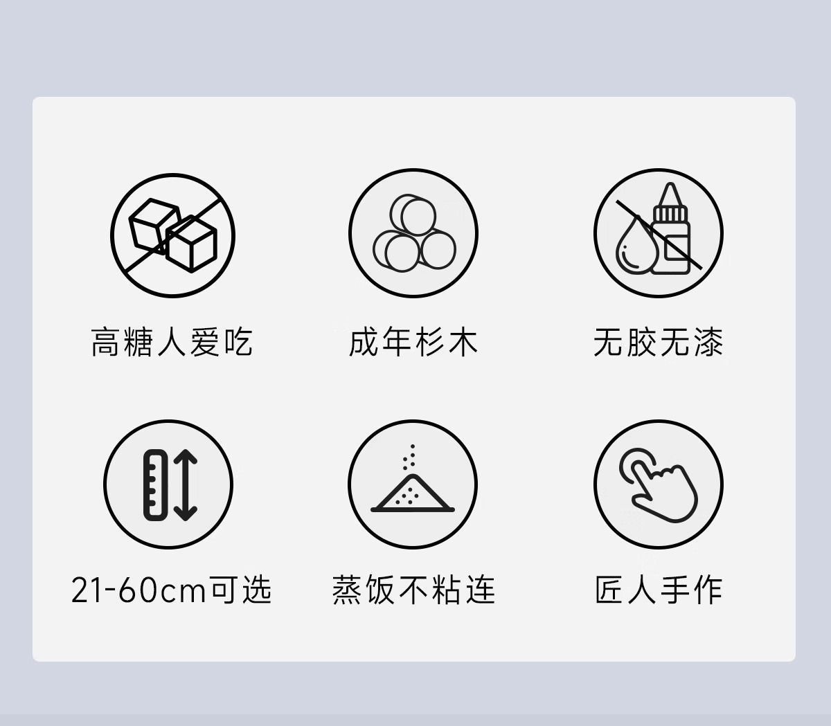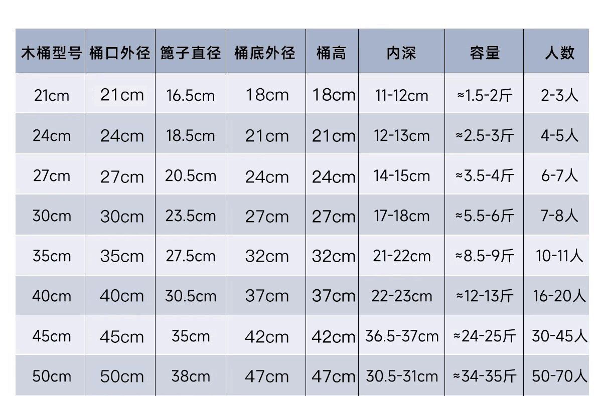 规格 竹编底子一个 蒸底,上口径21cm 建议2-3人,上口径24cm 建议4-5人,上口径27cm 建议6-7人,上口径30cm 建议7-8人,上口径35cm 建议10-11人,上口径40cm 建议16-20人,上口径45cm 建议30-45人,上口径50cm 建议50-70人