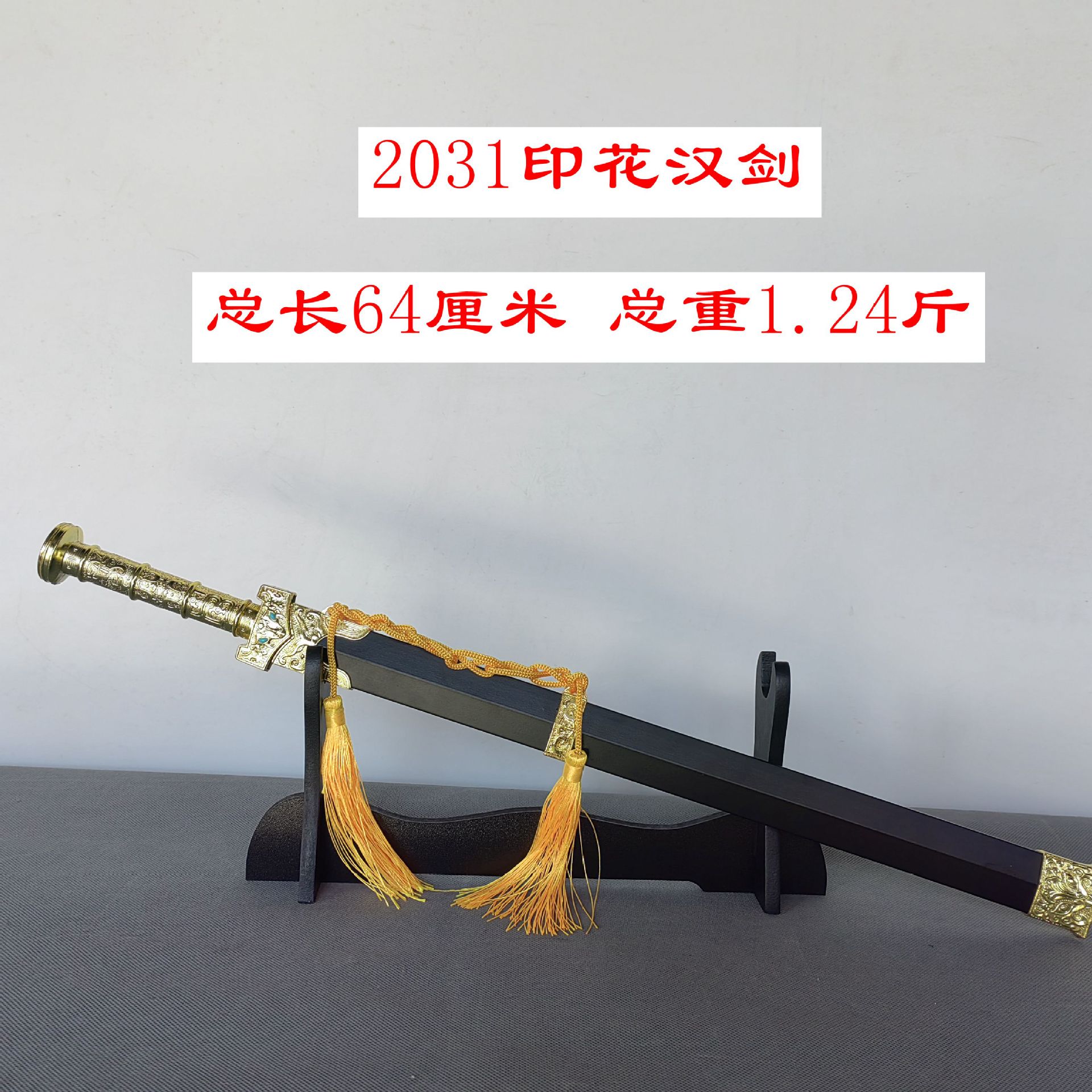 宝剑规格:总长44厘米 手柄11厘米 鞘长32厘米 剑身27厘米 重量0.60斤