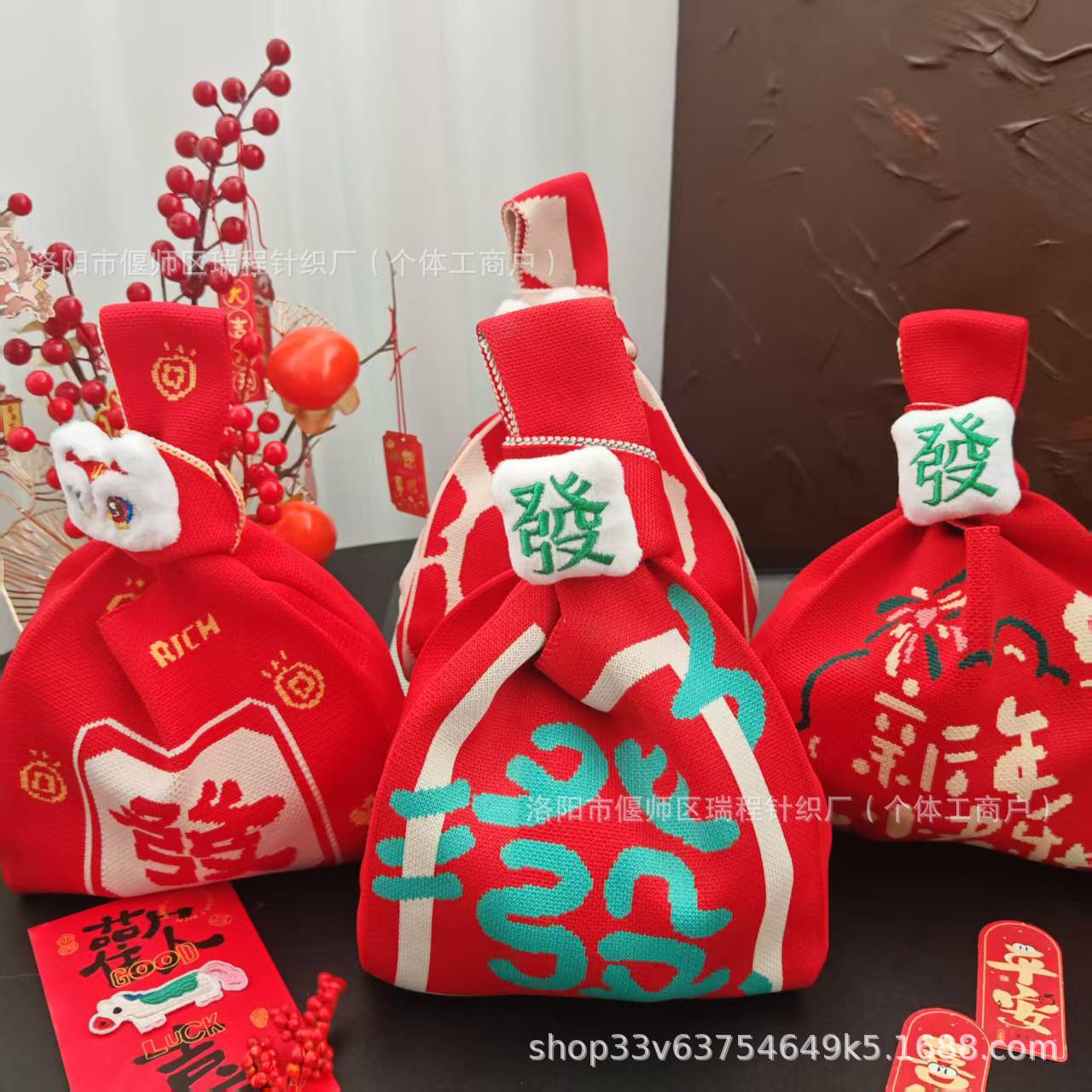 新年发财包红色针织手提袋年会礼品袋手提包喜庆伴手礼便携斜挎包