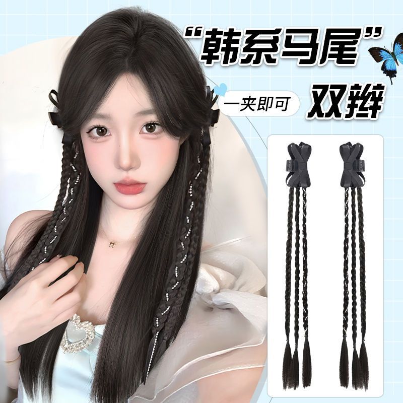 假发辫子女抓夹马尾ins风丝带双麻花辫蝴蝶结发饰新中式马尾辫子