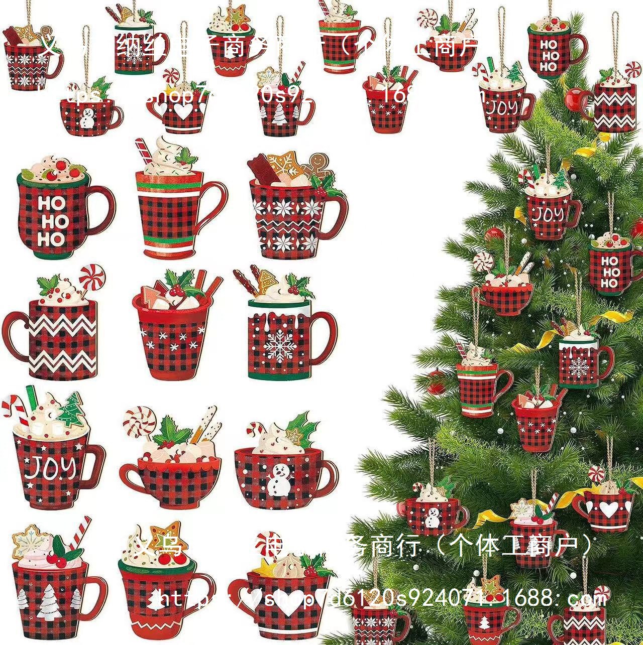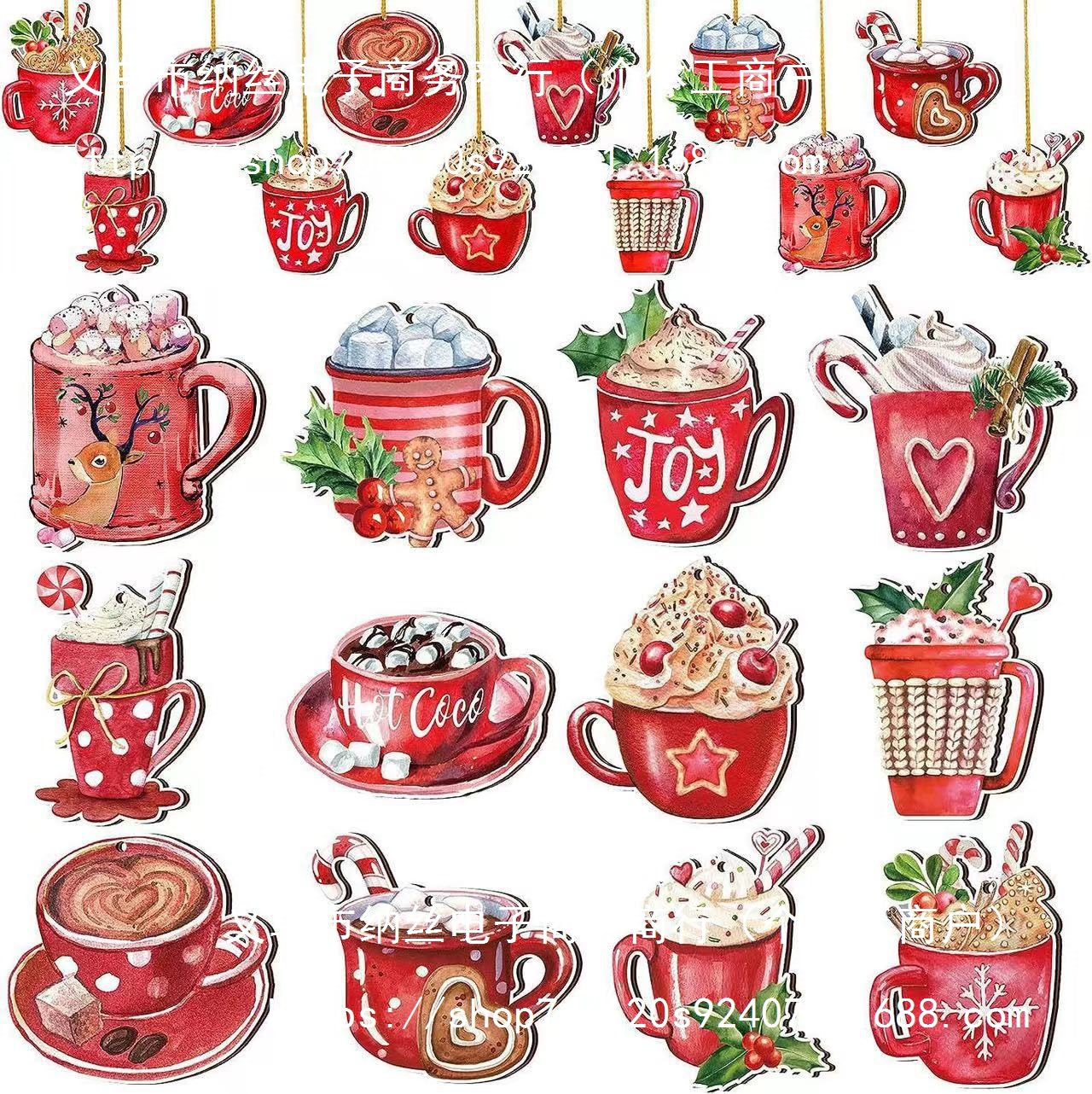 圣诞木制饰品带绳圣诞挂饰红色咖啡杯饰品咖啡吧装饰品圣诞树挂件