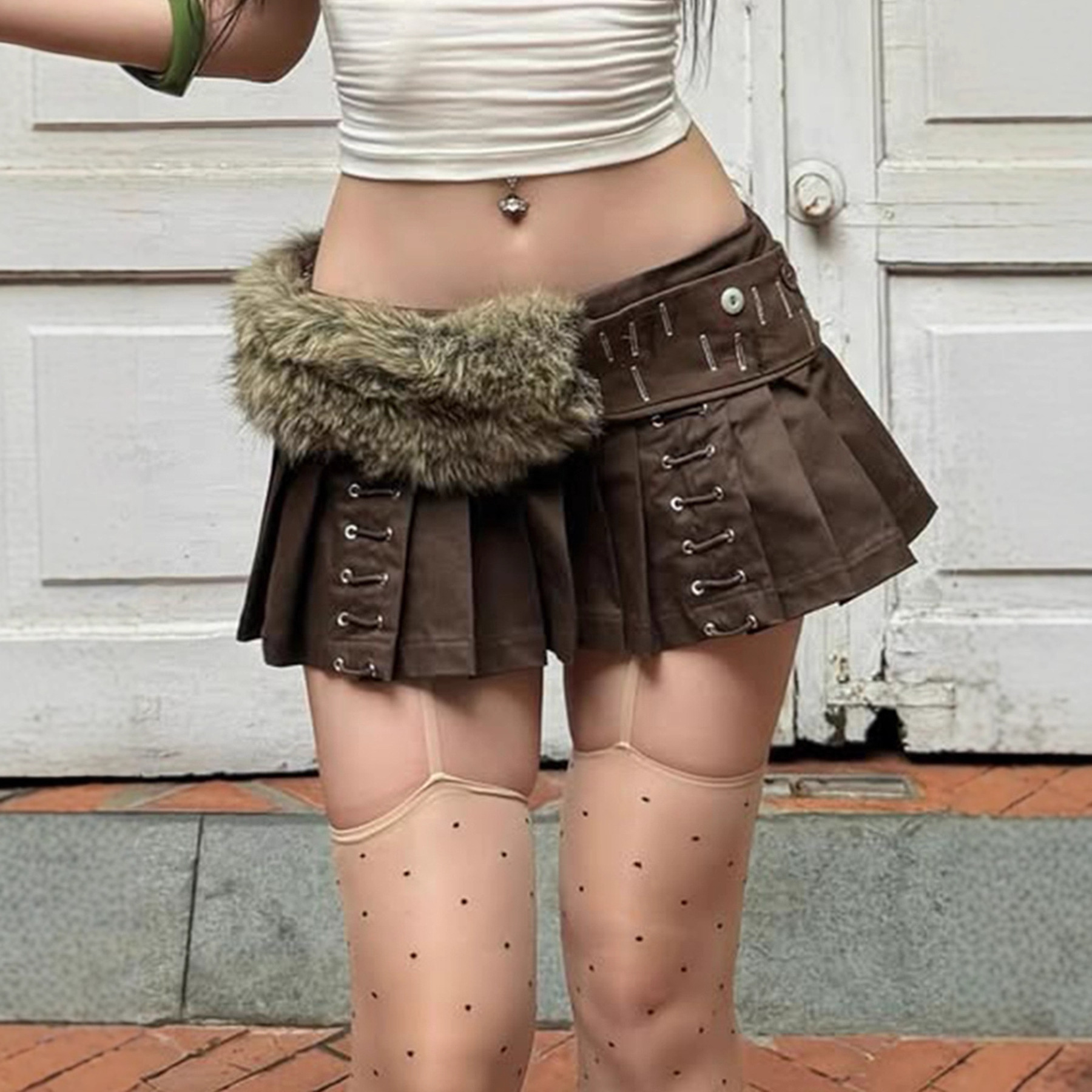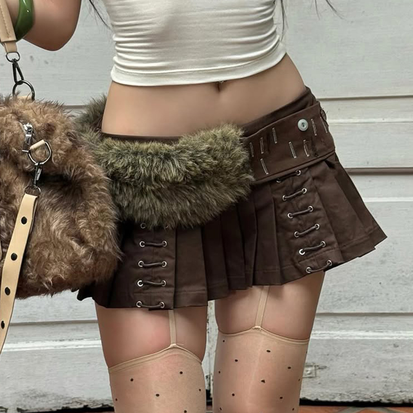 咖色毛绒拼接半身裙女春秋PU仿皮裙辣妹显瘦百搭高腰皮带包臀短裙